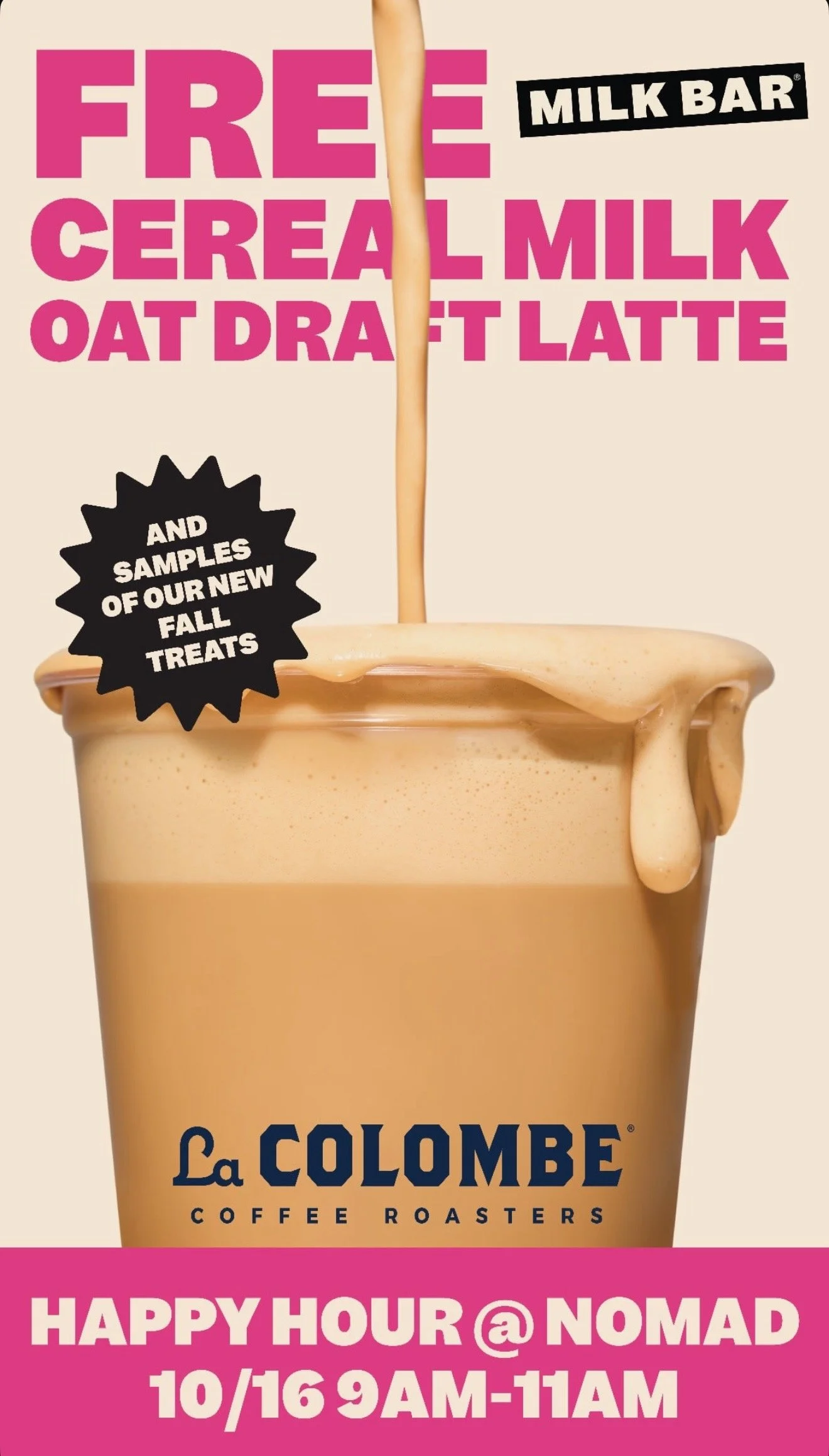 On 10/16 from 9am-11am, Milk Bar will be serving FREE Cereal Milk Oat Draft Lattes!