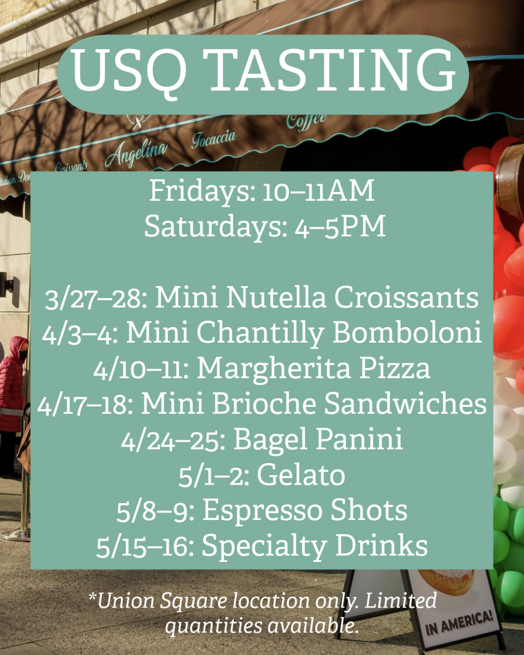 Missed Angelina Bakery’s free tastings before? They are back at Union Square EVERY week with fresh samples—from pastries to pizza, gelato, and more. Different bites, new reason to stop by each week.