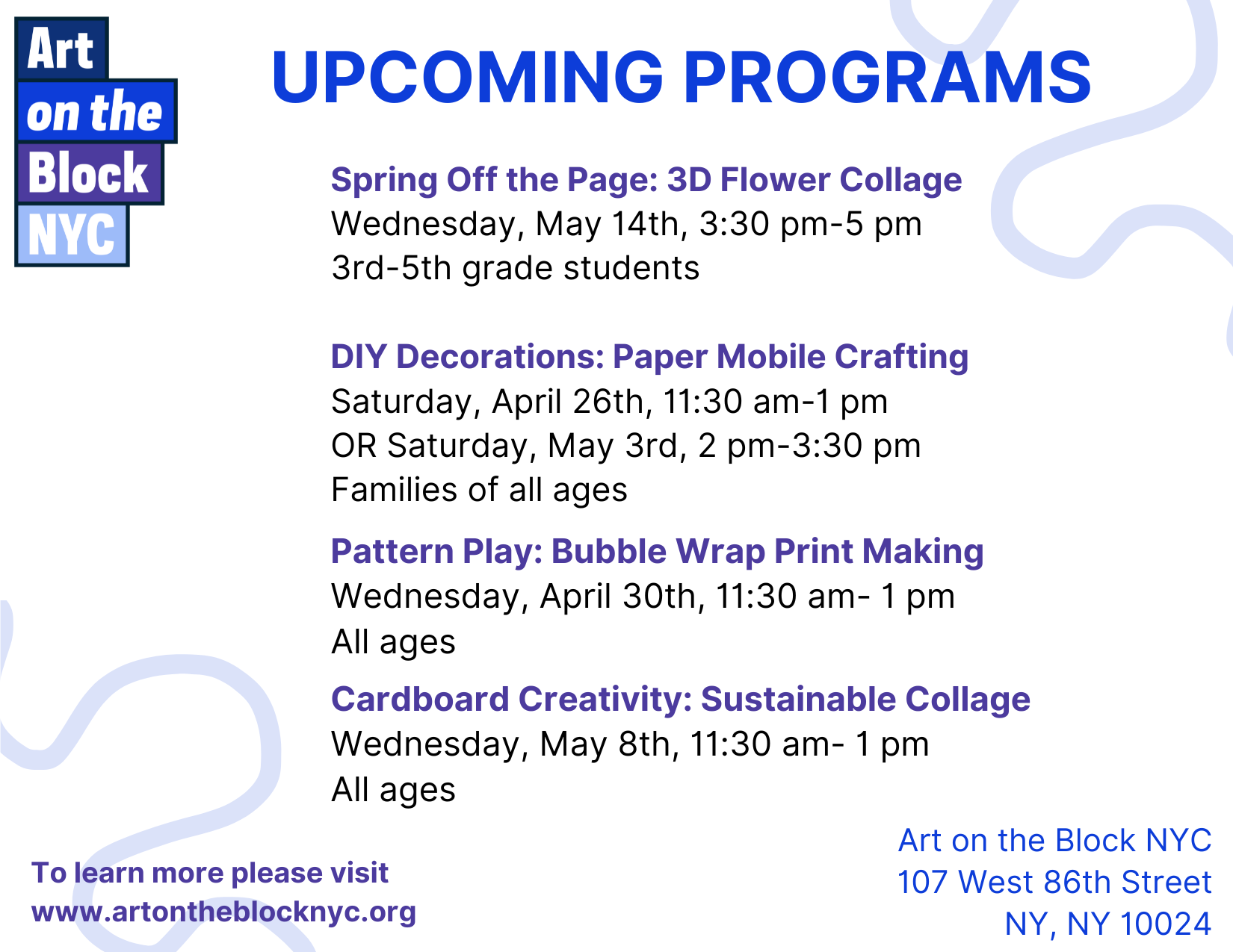 Join Art on the Block for a unique opportunity to create art with our artist-in-residence, Jaimee Todd. Registration is required. Space is limited. All programs take place at 107 West 86th Street.