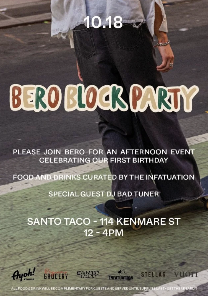 With food & drinks curated by The Infatuation, the Block Party will feature free BERO pours and immersive brand touchpoints throughout Santo Taco, including exclusive complimentary food collaborations like a BERO-inspired zucchini taco, chips and guacamole, and a special BERO Michelada-inspired beverage from Santo Taco, plus muffaletta and spicy giardiniera sandwiches from Regina’s Grocery x Ayoh! Guests can enjoy the flavors with a BERO brew in hand, while live DJ Bad Tuner keeps the energy high. Those waiting in line will also score limited-edition giveaways from Stellar Snacks pretzels, Vuori and more, available while supplies last!