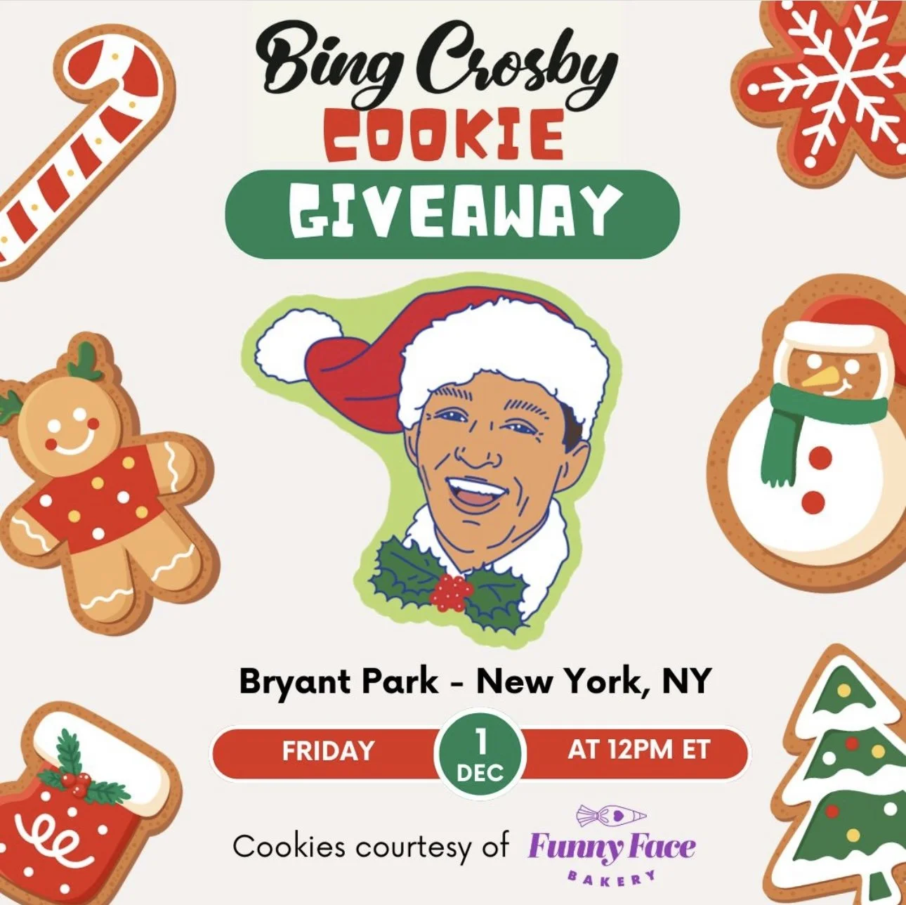 Find Bing’s “Holiday Ambassadors” to get a FREE mini Bing cookie created by Funny Face Bakery 🎄🎶