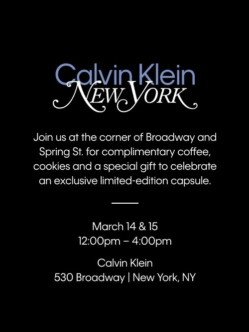 Join Calvin Klein at the corner of Broadway and Spring St. for complimentary coffee, cookies and a special gift to celebrate an exclusive limited-edition capsule.