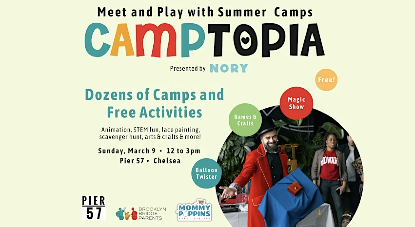 NYC's biggest summer camp fair, CAMPTOPIA, presented by NORY, is coming to Pier 57 in Chelsea. Experience camps in person with 30 free kids activities for all ages, including a magic show, Wicked musical theater workshop, robotics & STEM fun, games, crafts, freebies, and more. It's the most fun way to find the perfect summer camp possible!