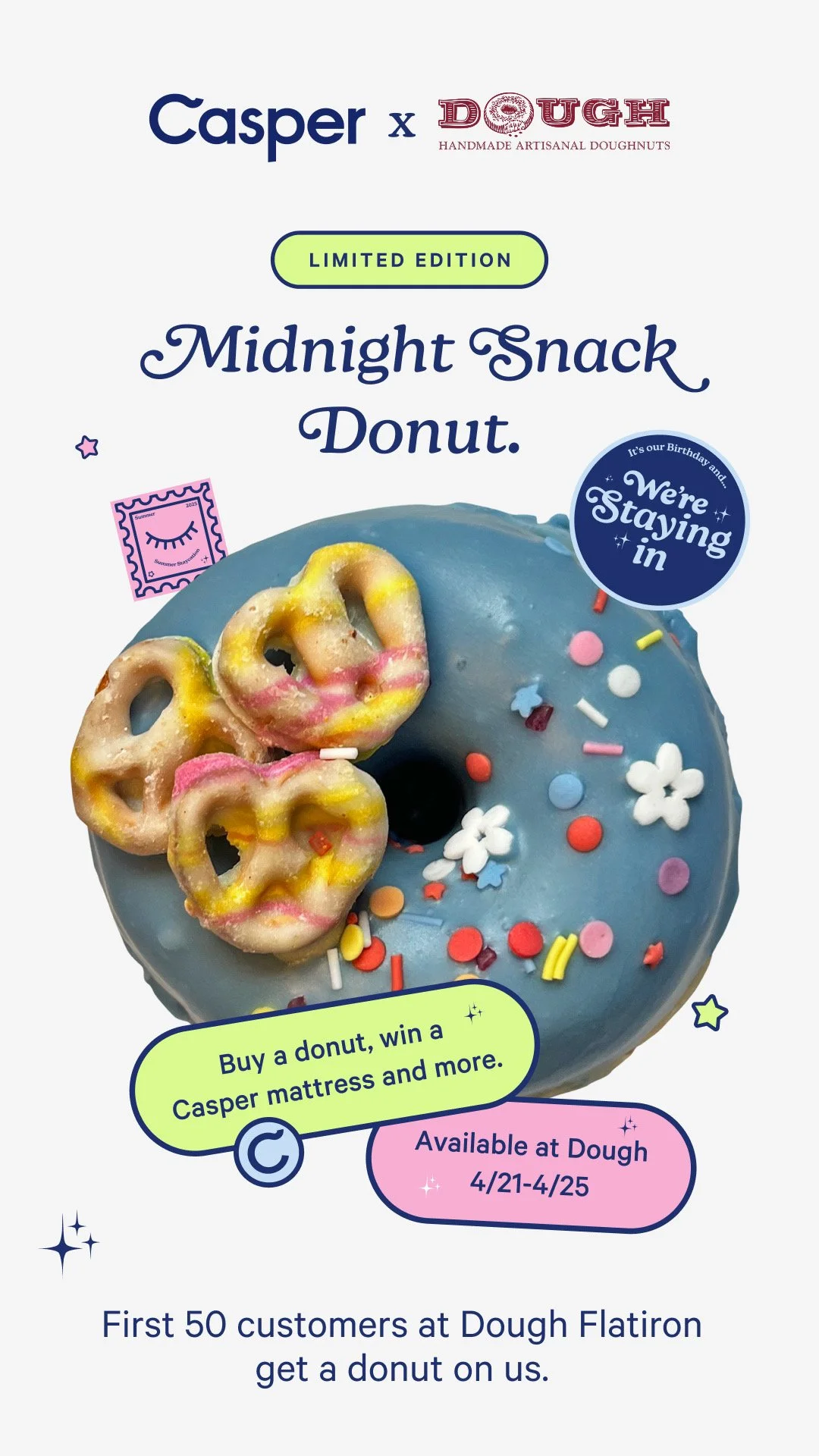 It’s Casper’s birthday, and they are partnering with Dough Doughnuts on a speciality limited-edition Midnight Snack donut available 4/21-4/25 at all Dough locations.