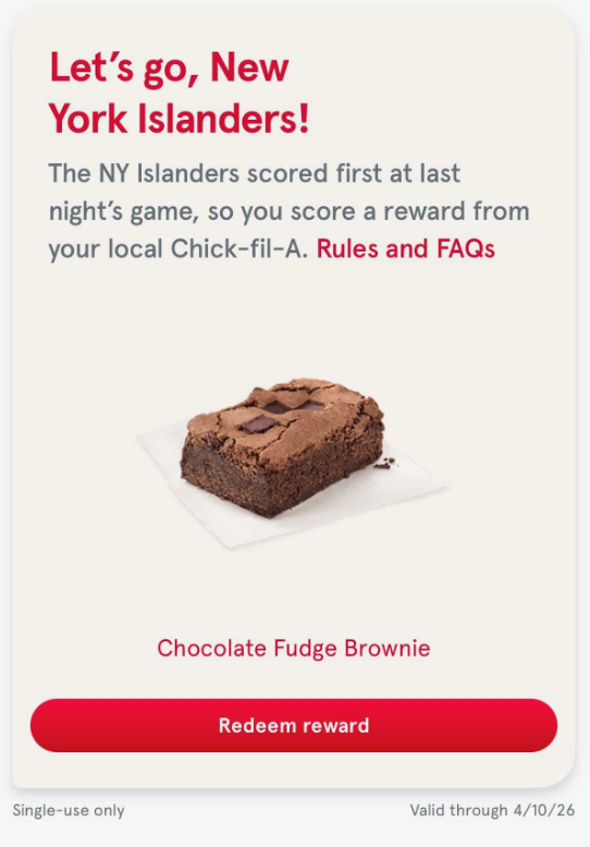 New York Islanders: check your Chick-fil-A app for a tasty reward! Chick-fil-A is giving fans a free reward available through the Chick-fil-A App for scoring the first goal in last night’s game. Today’s reward is a Brownie!