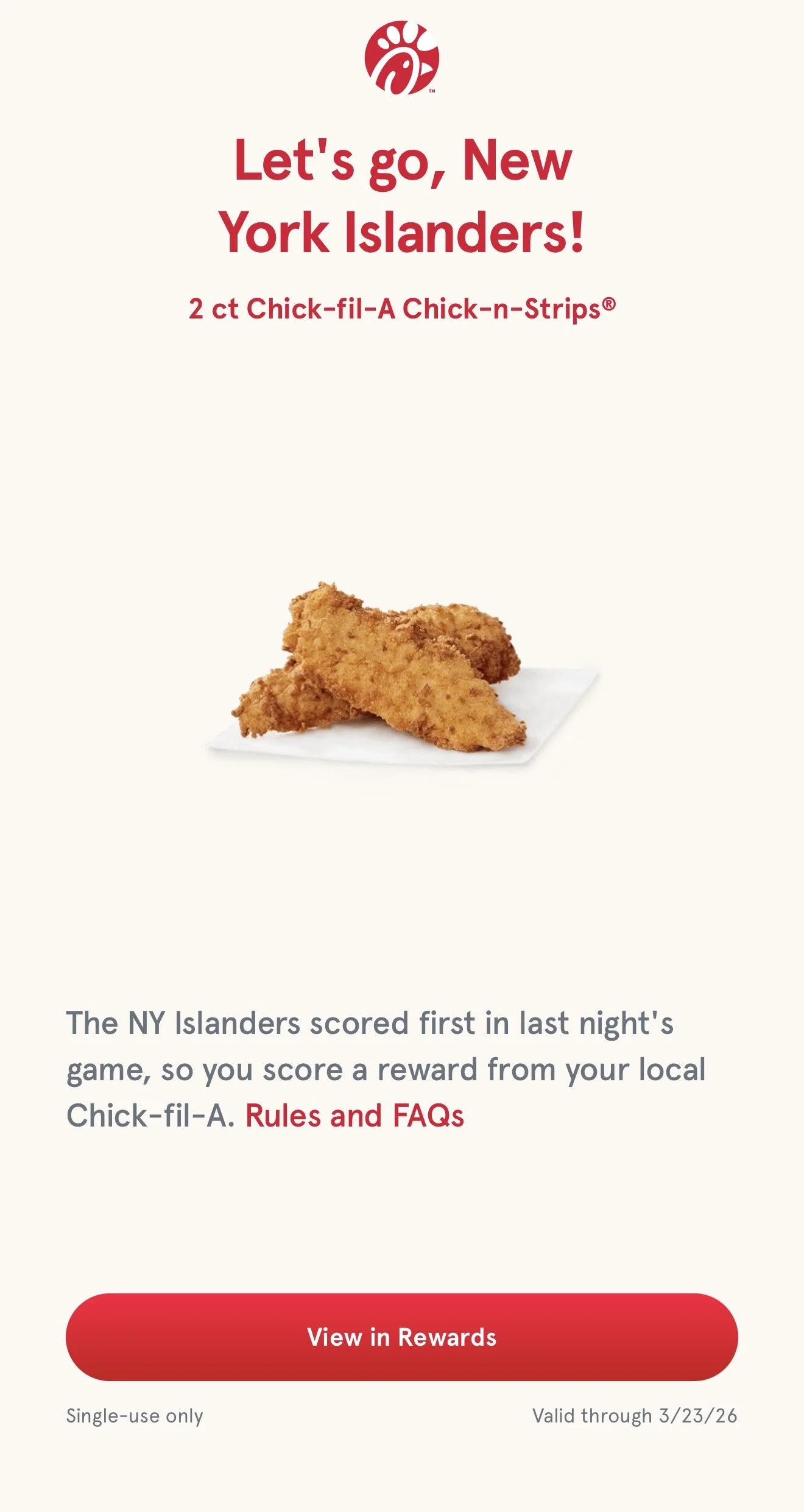 New York Islanders: check your Chick-fil-A app for a tasty reward! Chick-fil-A is giving fans a free reward available through the Chick-fil-A App for scoring the first goal in last night’s game. This time it is a 2ct of Chick-n-Strips!