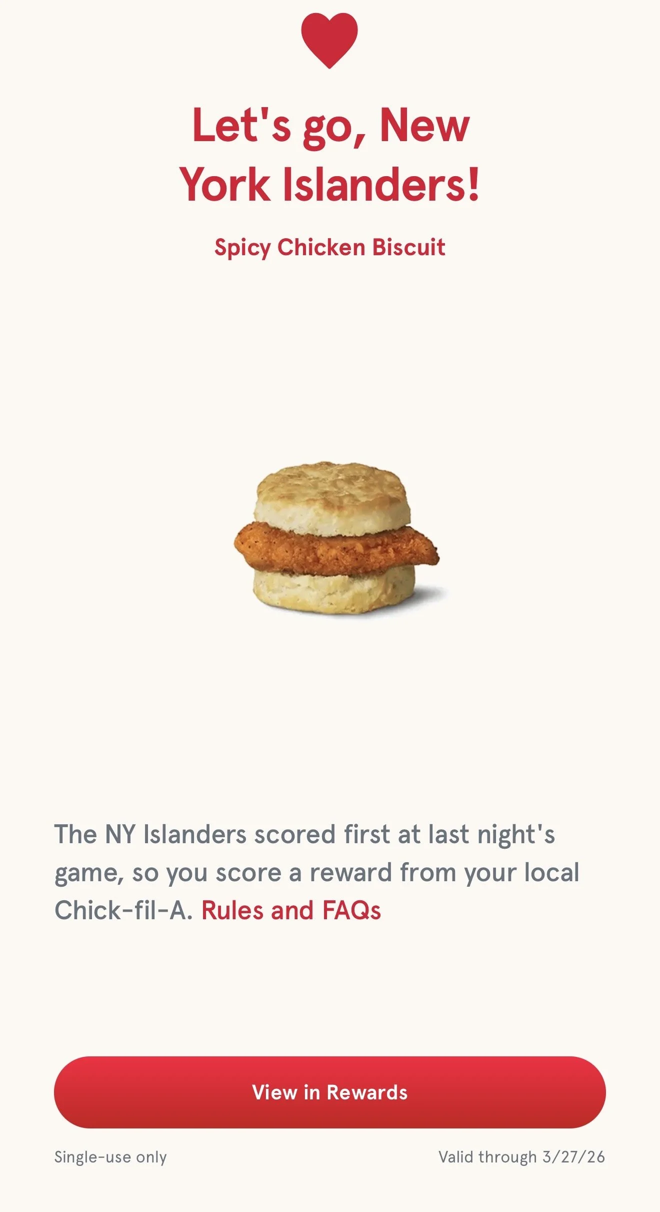 New York Islanders: check your Chick-fil-A app for a tasty reward! Chick-fil-A is giving fans a free reward available through the Chick-fil-A App for scoring the first goal in last night’s game. This time it is a Spicy Chicken Biscuit