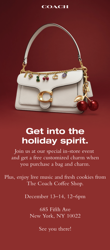 Join Coach at a special in-store event and get a free customized charm when you purchase a bag and charm.
