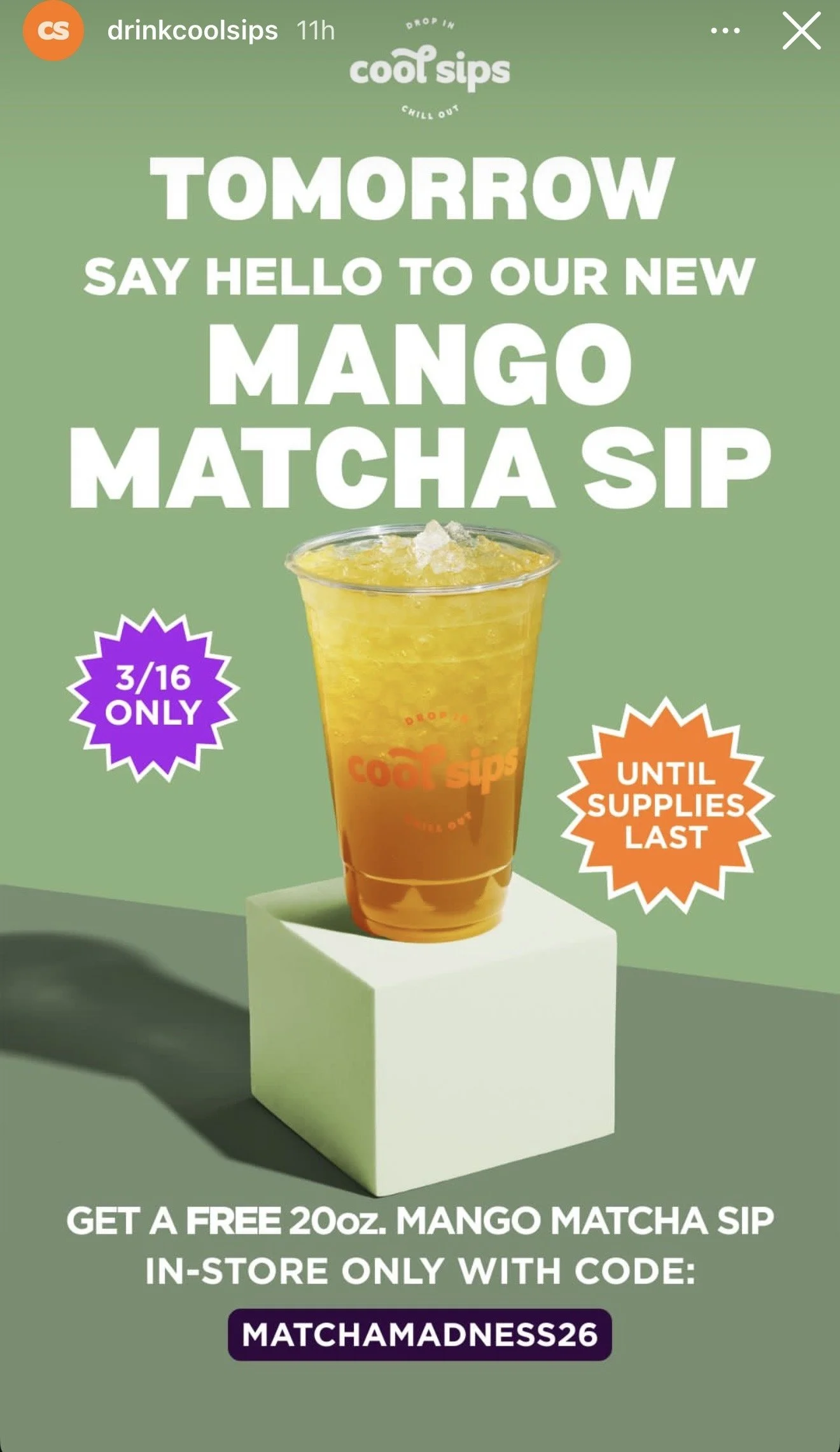 Get a free 20oz. Mango Matcha Sip in-store only with code: MATCHAMADNESS26