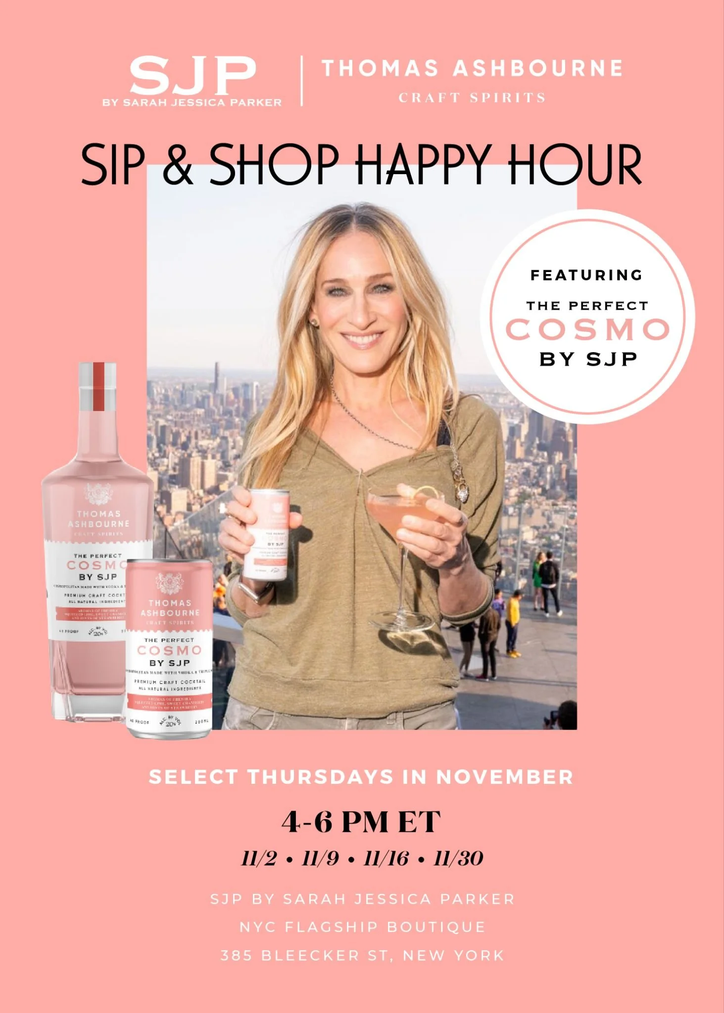 What’s more New York than Sarah Jessica Parker and Cosmos? If you’re in the West Village this, be sure to stop by the Sip & Shop Happy Hour series presented by Thomas Ashbourne Craft Spirits and SJP by Sarah Jessica Parker.