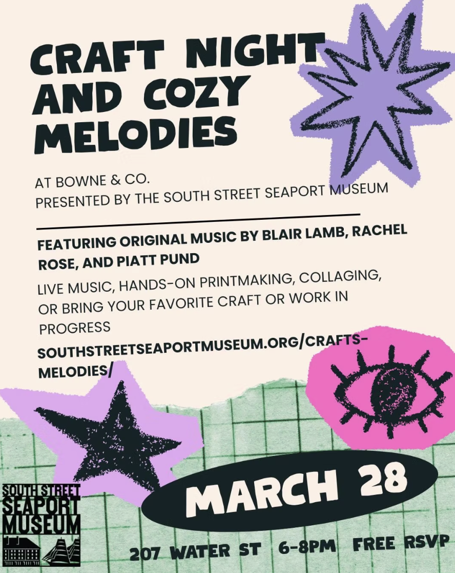In between songs, dive into collage-making with materials provided by the Seaport Museum—or bring your favorite craft along for the fun. Knitting, crochet, embroidery, sketching, and more are all welcome, making this a relaxed evening to create, connect, and be inspired.