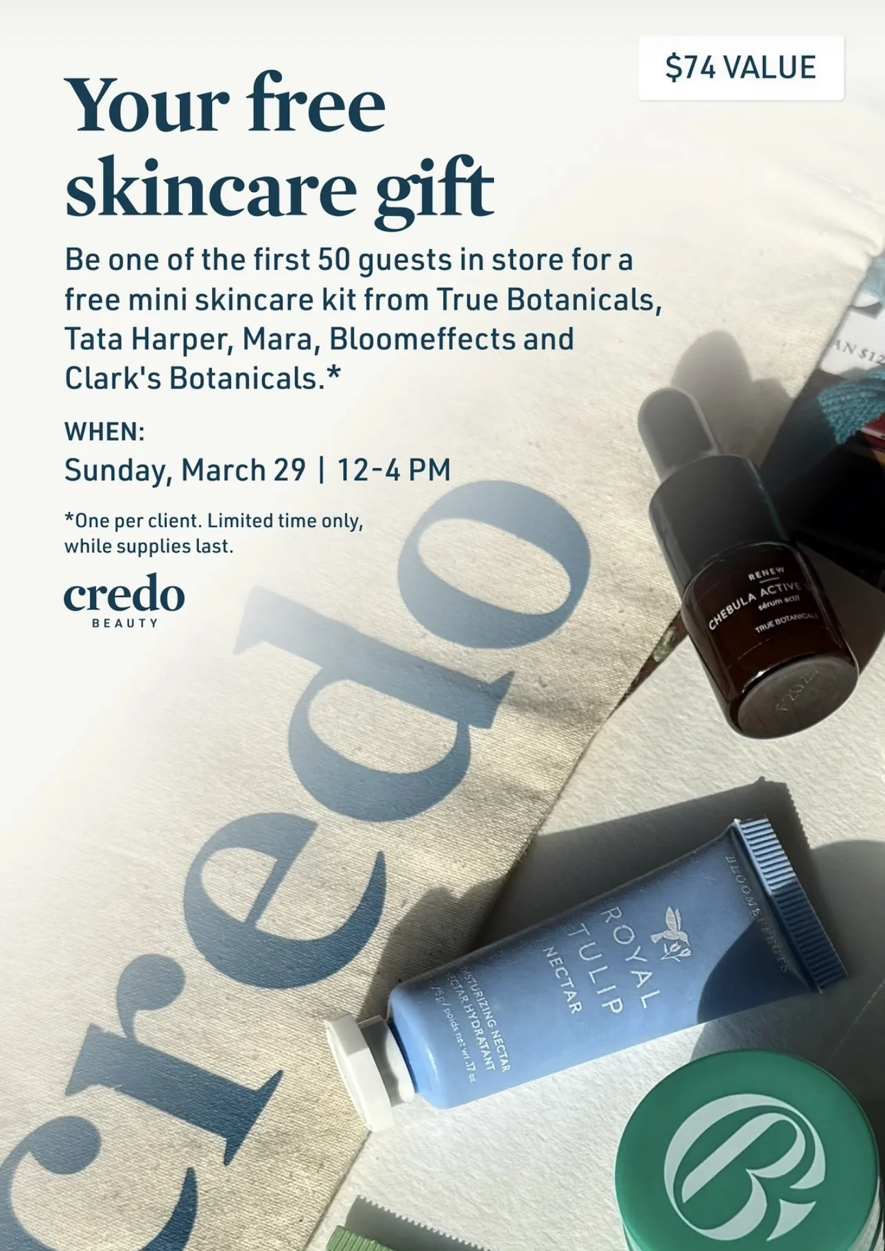 Be one of the first 50 guests in store for a free mini skincare kit from True Botanicals, Tata Harper, Mara, Bloomeffects and Clark's Botanicals.*