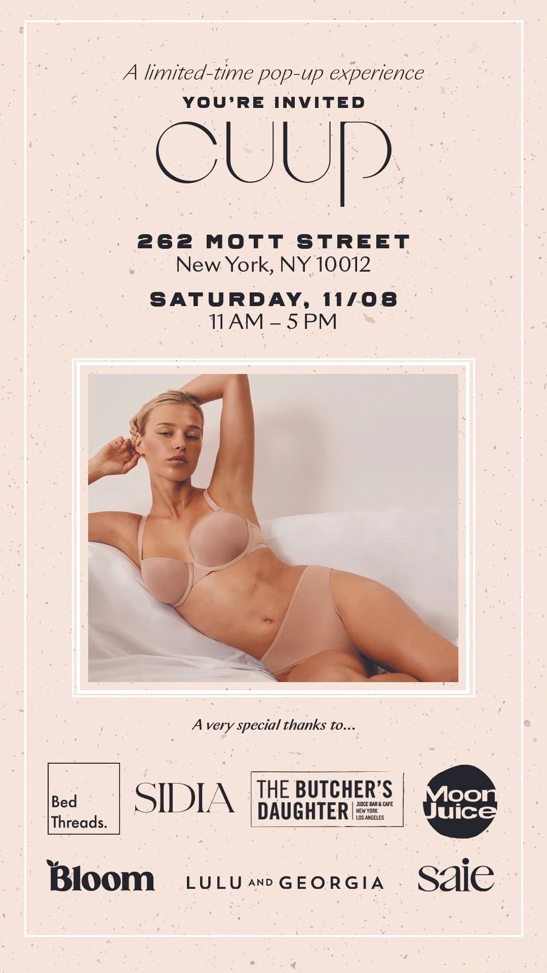 It’s an intimate, design-led space inspired by “coming home for the holidays,” featuring CUUP’s new and core collections and bra fit sessions.