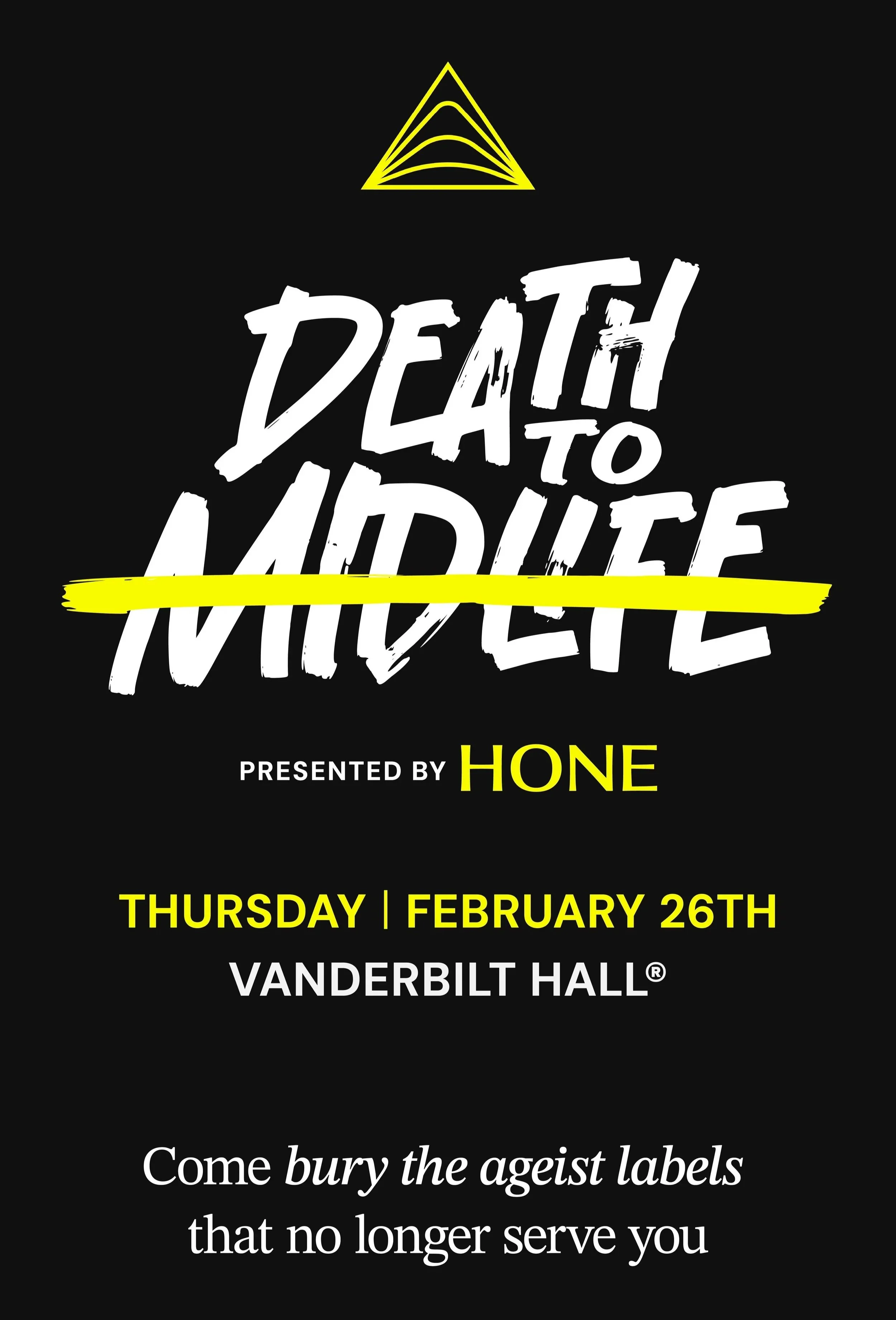 Join Hone Health for a full-day takeover of Vanderbilt Hall at Grand Central Terminal as they officially declare: Death to Midlife.