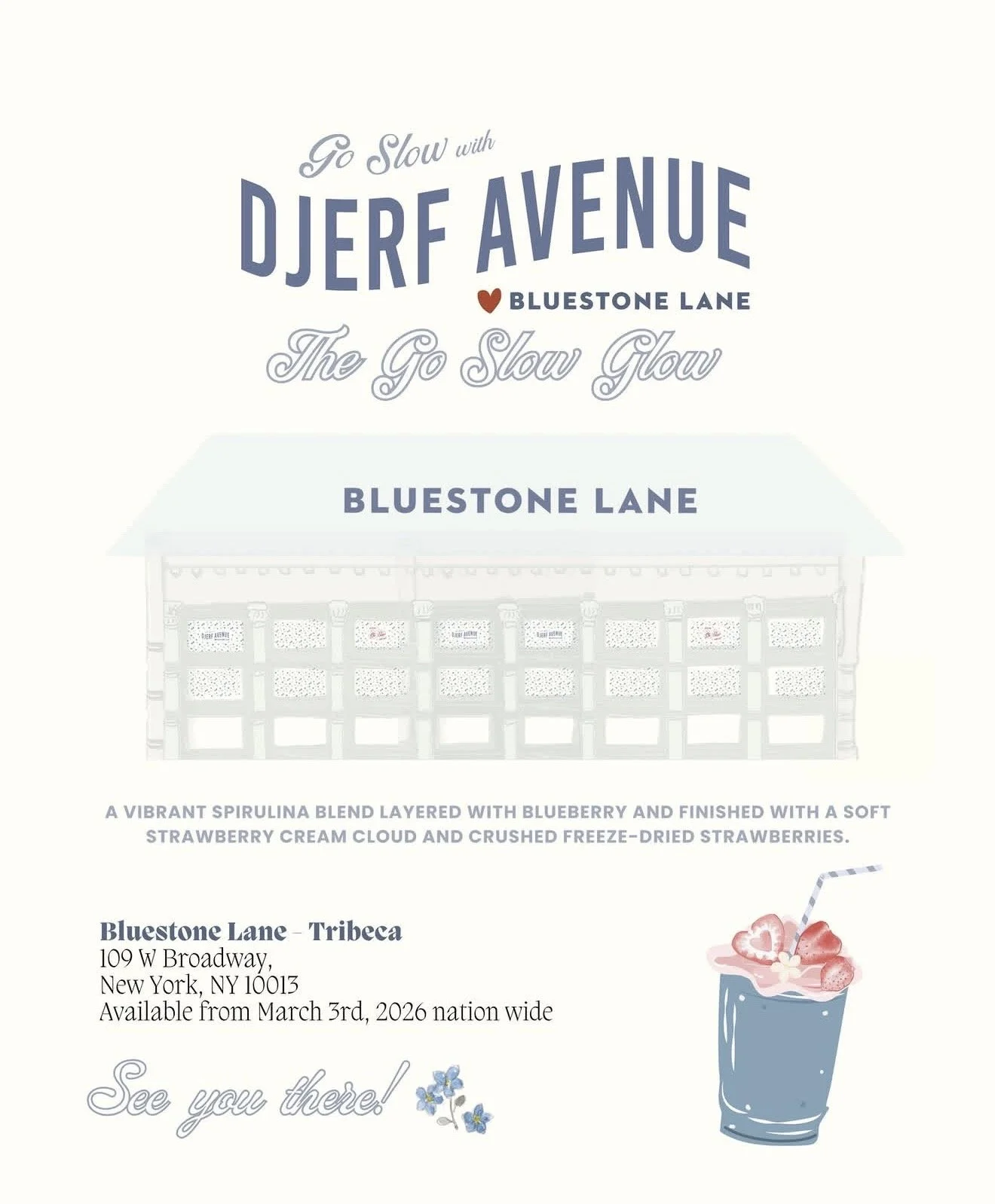 Djerf Avenue is partnering with Bluestone Lane for the second time — The Go Slow Glow will be available nationwide starting March 3rd!