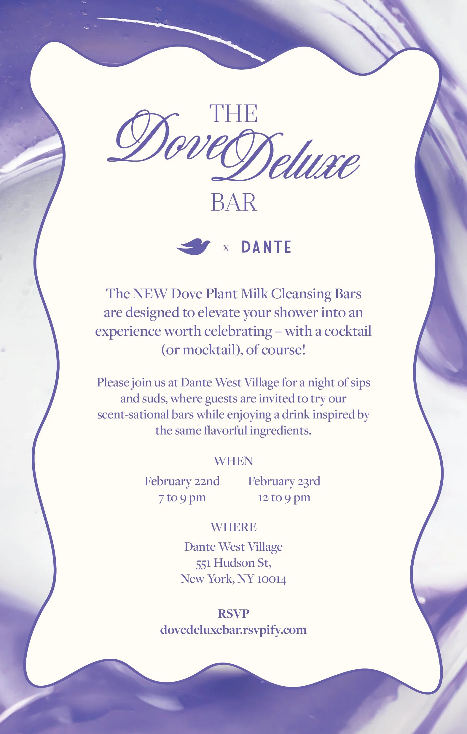The brand will host a two-day pop-up experience in New York City at Dante West Village. The Deluxe Bar will immerse guests in the sensorial world of the new Dove Plant Milk Cleansing Bars and the key ingredients that inspired each delicious fragrance.