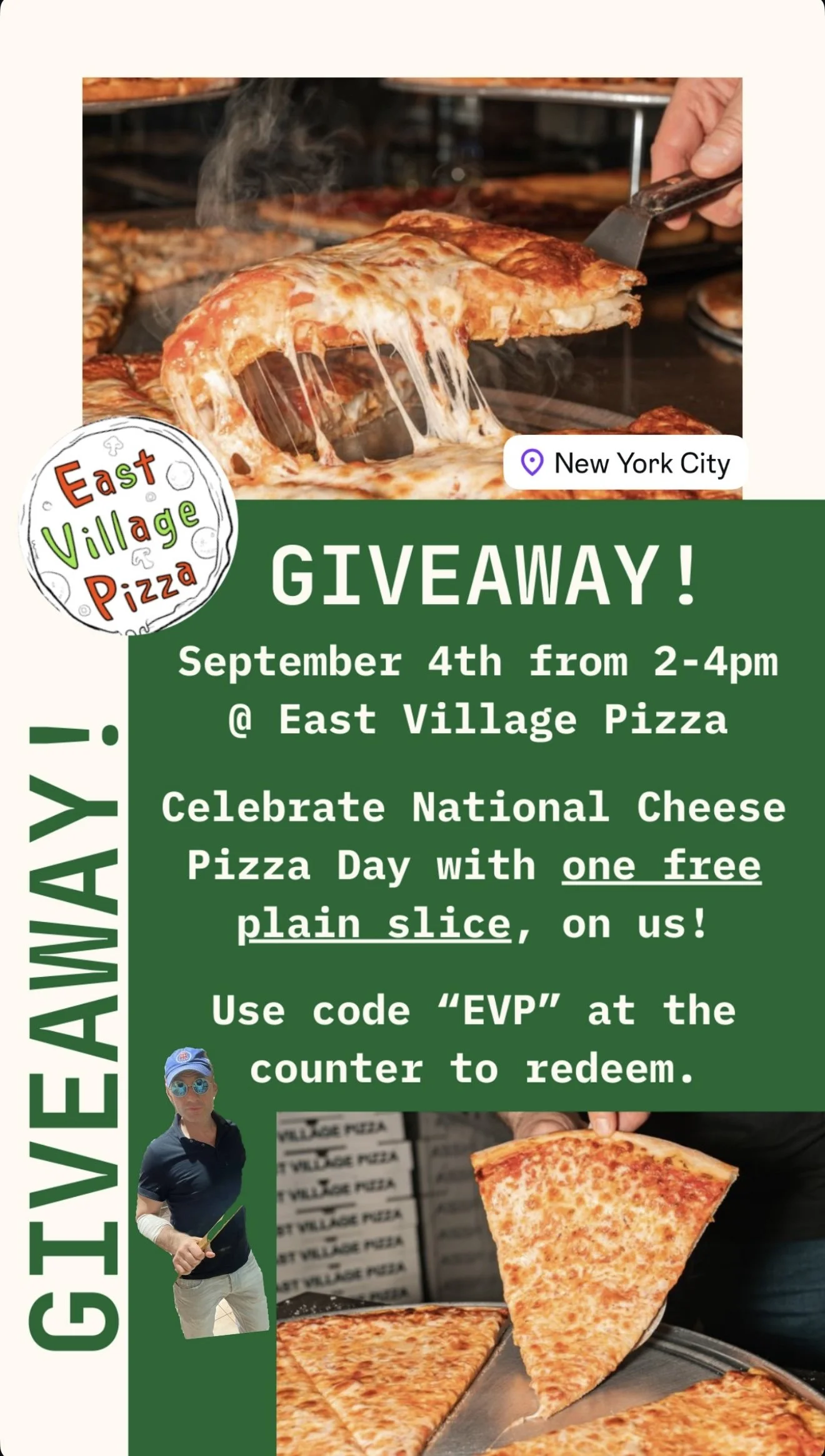 Who can resist a free slice of traditional NY-style cheese pizza? Get ready for a FREE, cheesy treat in celebration of National Cheese Pizza Day by visiting East Village Pizza on Thursday, September 4th, to claim your free slice!