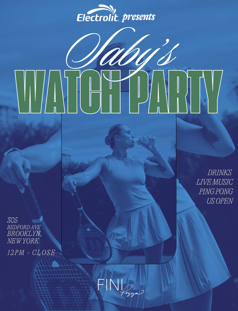 Join Fini Pizza this weekend for our ongoing celebration of tennis in NYC and Saby's Slice Shop presented by Electrolit. We'll be watching all the matches, listening to great music, enjoying Saby slices, playing ping pong, and feeling the summer vibes.