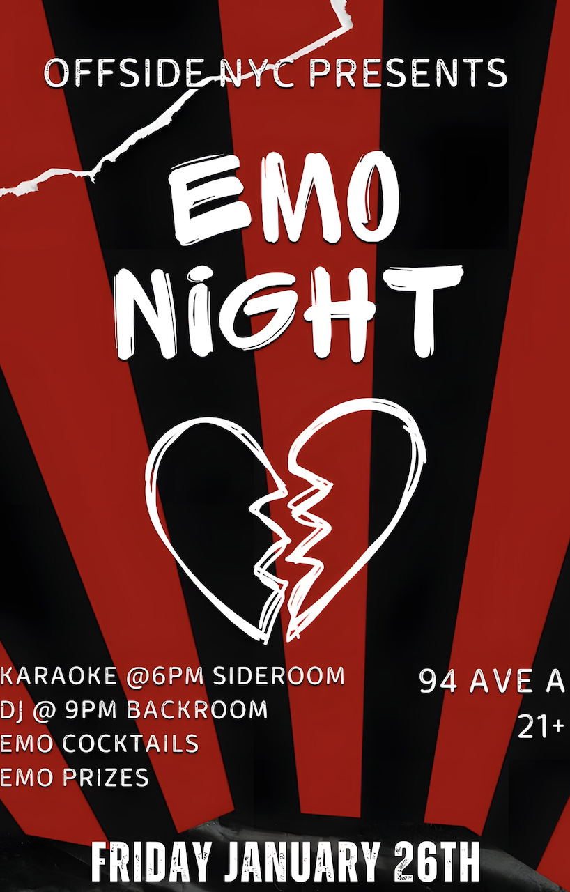Head to Offside NYC for your favorite emo/pop punk/punk rock hits all night long! Live DJ, themed drinks, prizes for best dressed, organized karaoke... #itwasneveraphase