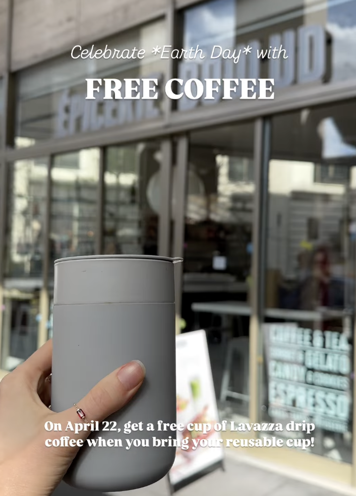 Bring your reusable cup to participating locations on April 22, and enjoy a free cup of Lavazza drip coffee on them.