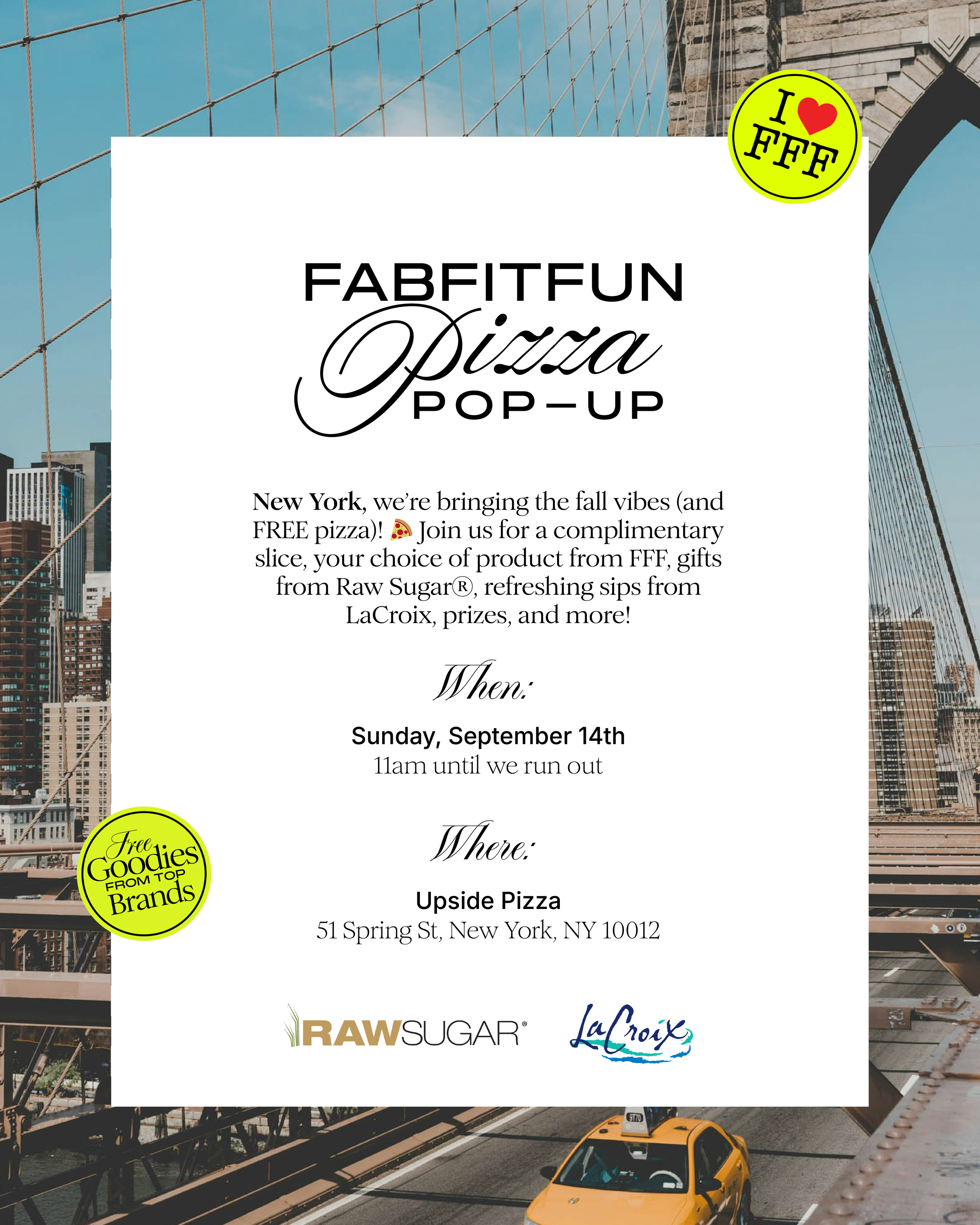 Join us at Upside Pizza on 9/14 starting at 11am for a FREE slice of pizza, a FabFitFun product of your choice, sips from LaCroix, gifts from Raw Sugar®, prizes, and more.