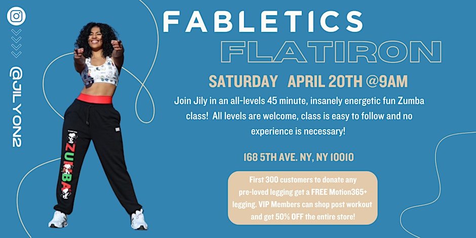 There will also be a Fabletics x Zumba with Jily event that morning! Get ready to sweat, dance, and have a blast Join us on Sat, Apr 20, 2024 at 9:00 AM at 168 5th Ave for a fun-filled workout session that combines the best of Fabletics activewear with the high-energy moves of Zumba. Whether you're a seasoned Zumba pro or a complete beginner, this event is perfect for anyone looking to have a great time while getting fit. Don't miss out on this exciting opportunity to dance your way to a healthier you!