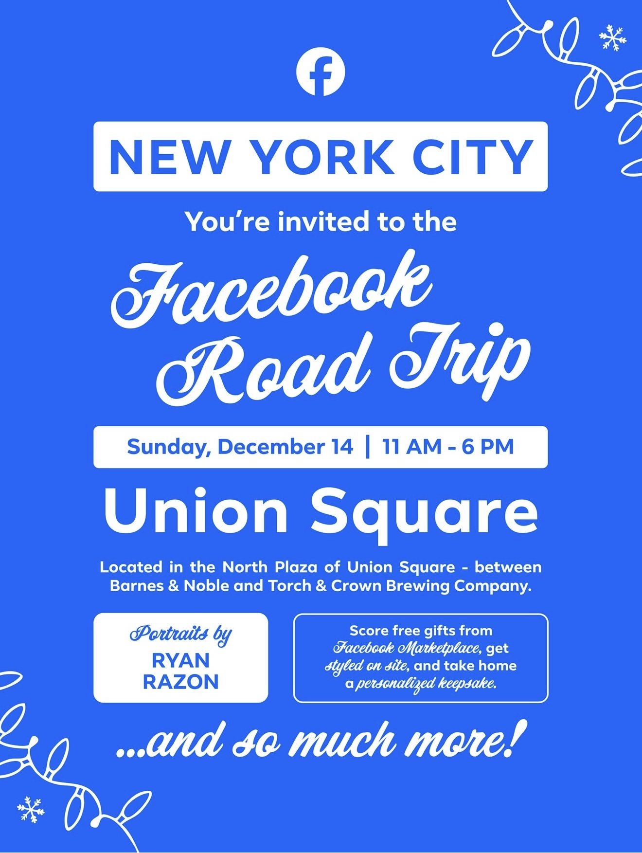 The final stop of the #FacebookRoadTrip arrives at Union Square, where visitors can sip cocoa, and enjoy free hands-on holiday activities inspired by Facebook Marketplace.