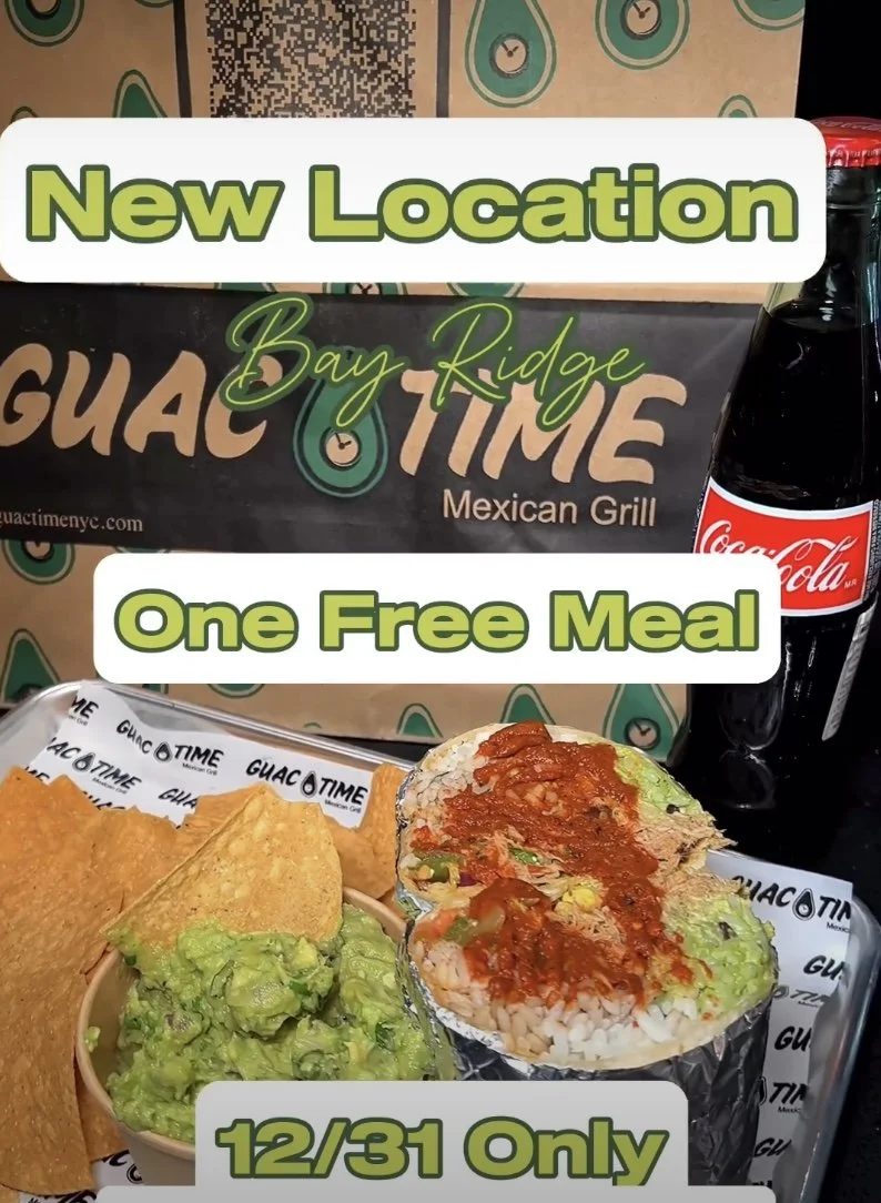 Guac Time’s Bay Ridge Location is finally opening on Sunday 12/31! To celebrate, you can get a free menu item from 2pm-6pm