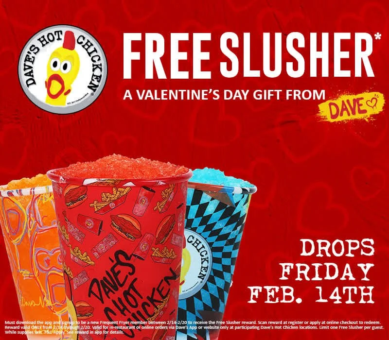 Must be a current Frequent Fryer member or download and signup in the app between 2/14-2/20/25 to receive the Free Slusher reward. Scan reward at register or apply at online checkout to redeem. Reward valid ONLY from 2/14-2/20. Valid for in-restaurant or online orders via Dave’s App or website only at participating Dave's Hot Chicken locations. Limit one Free Slusher per guest. While supplies last. T&C Apply. See reward in app for details.