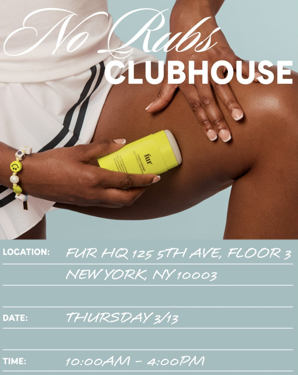Join Fur in celebrating the launch of Chafe Cushion at No Rubs Clubhouse—your comfort zone at Fur HQ. ☁️ Open for one day only, this is your destination to shop and try Chafe Cushion, and receive a mini Fur Oil manicure with purchase.