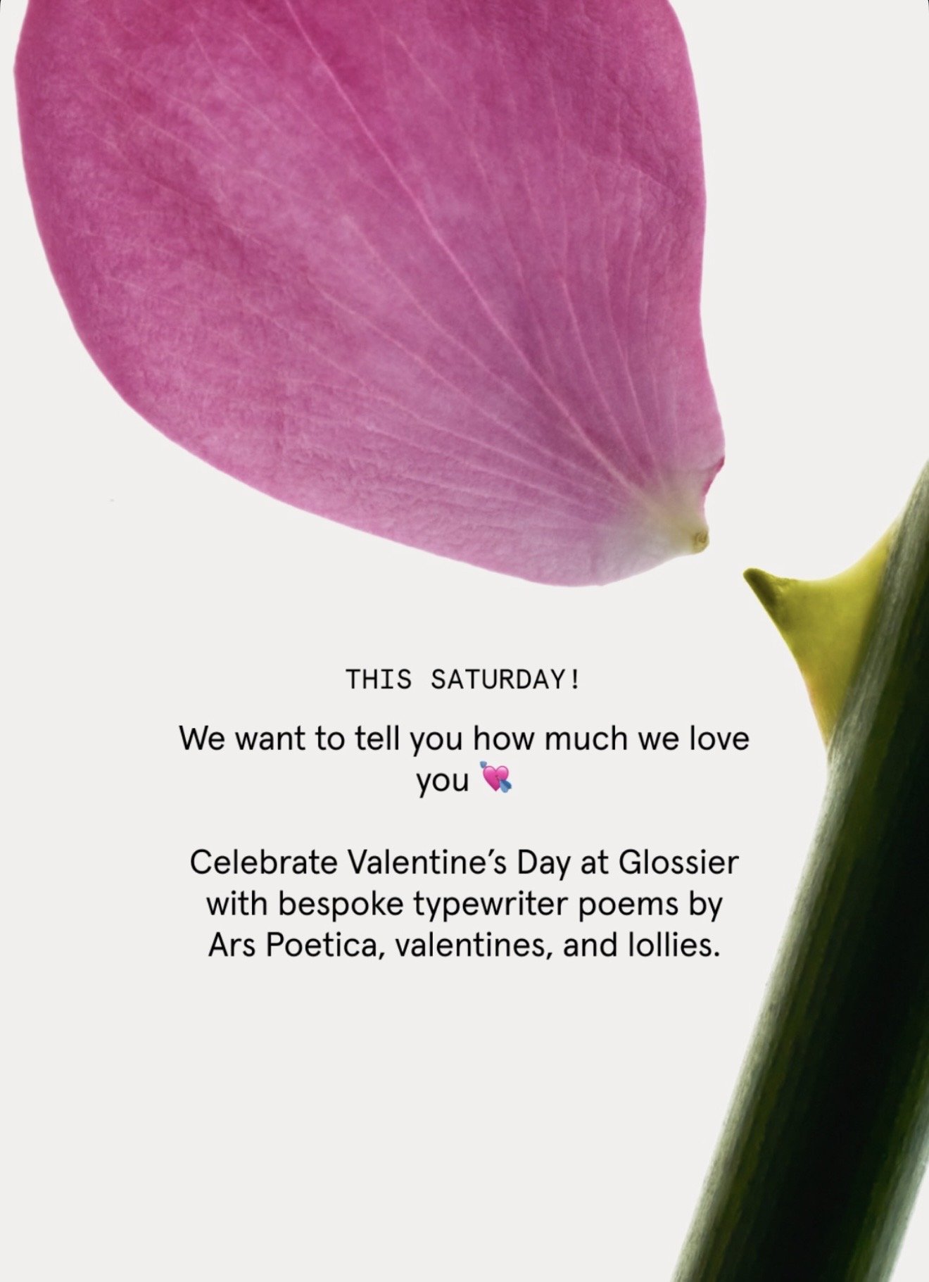 Celebrate Valentine's Day at Glossier with bespoke typewriter poems by Ars Poetica, valentines, and lollies.