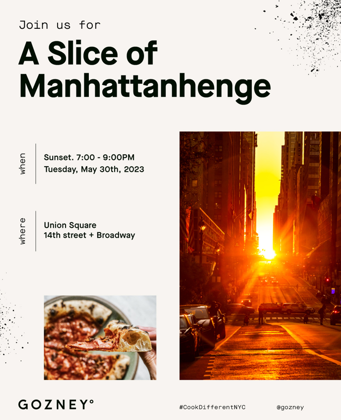 Join premium outdoor oven brand, Gozney, as they celebrate Manhattanhenge while sharing free pizza with New Yorkers looking to capture photos of the annual Manhattanhenge sunset.