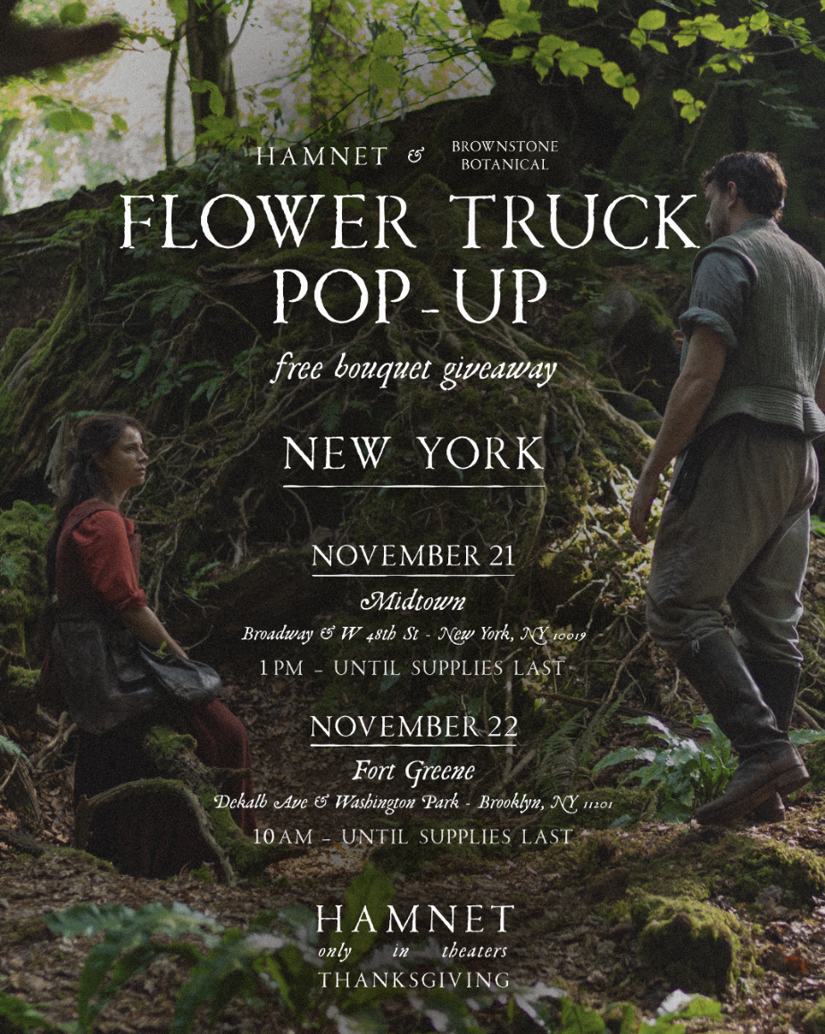 Celebrating the upcoming film, HAMNET, starring Jessie Buckley & Paul Mescal, with a free flower truck pop-up this weekend with Brownstone Botanical.