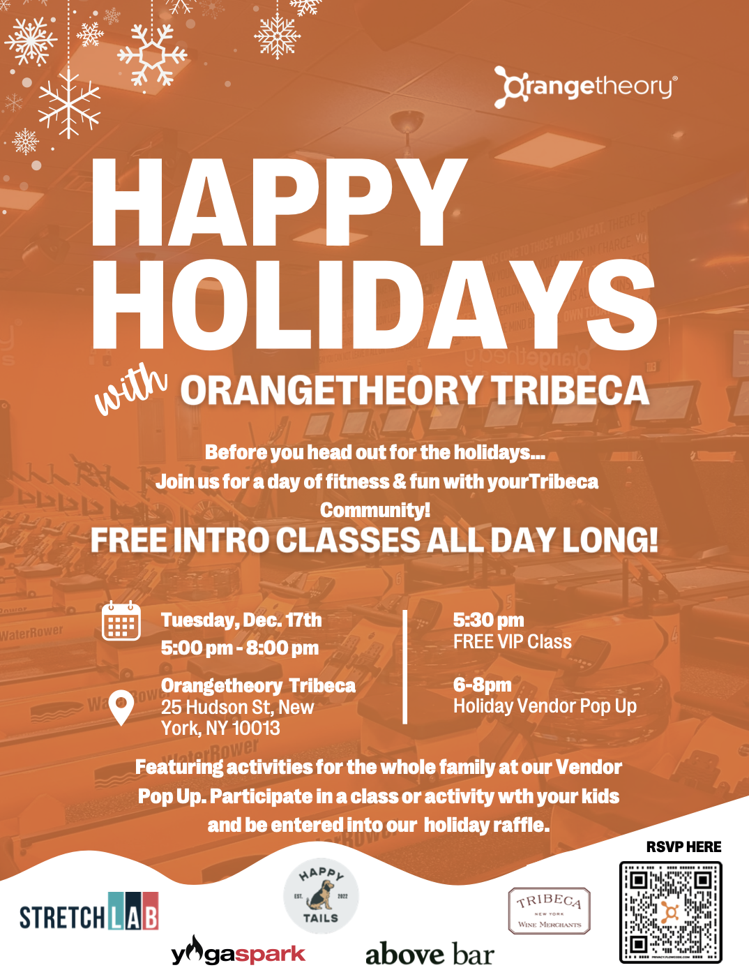 Before you head out for the holidays, join Orangetheory Tribeca for a day of fitness, fun, and family vibes! Enjoy FREE intro classes all day long, plus check out local vendors like Stretch Lab and Tribeca Wine Merchants! πββοΈπ·