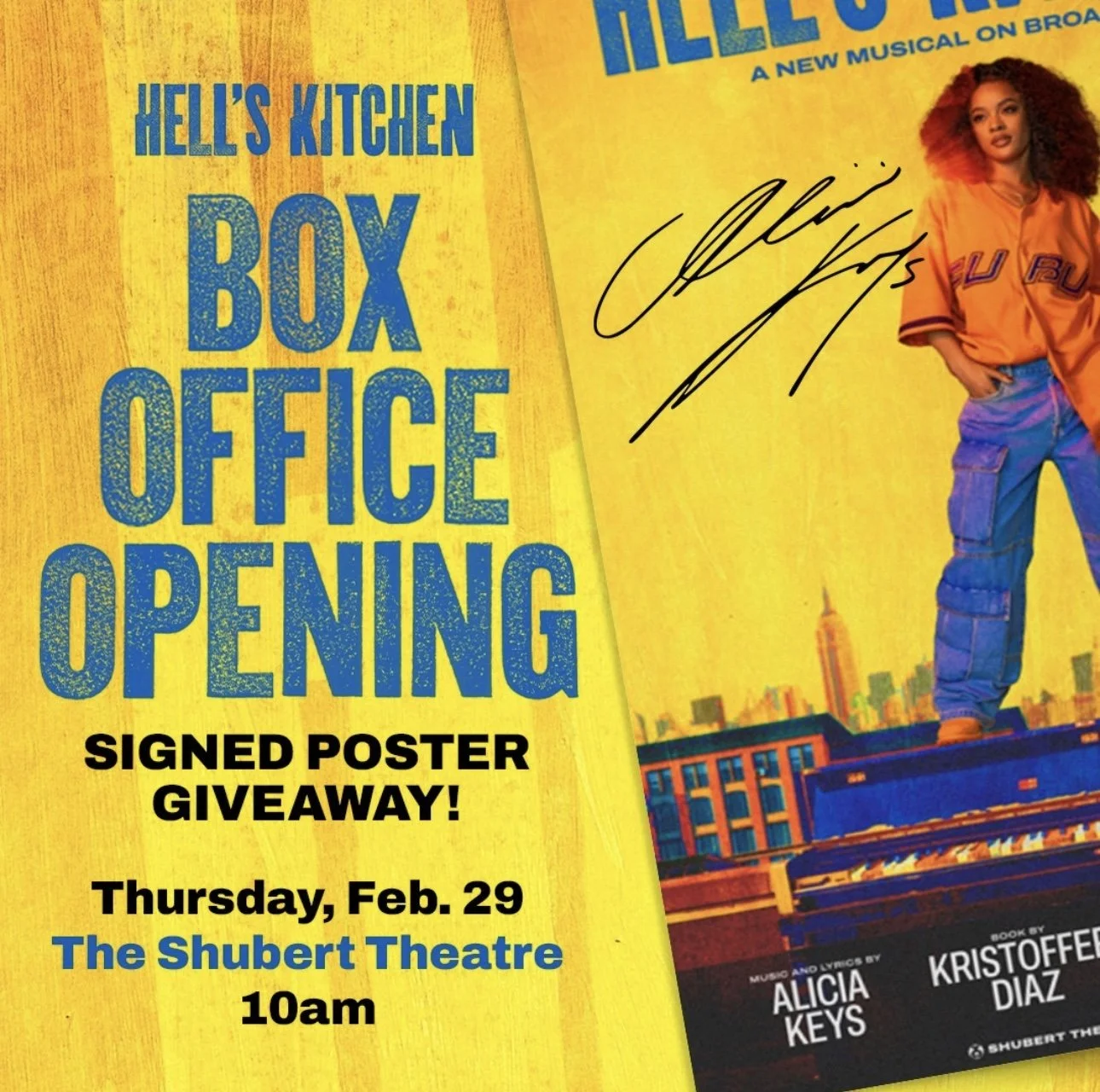 Celebrate the Box Office Opening of Hell’s Kitchen this Thursday! Stop by the Shubert Theatre at 10am and join for donuts from Cloudy Donuts, cookies from Gooey on the Inside, giveaways (including a signed poster giveaway) and maybe even a special appearance!