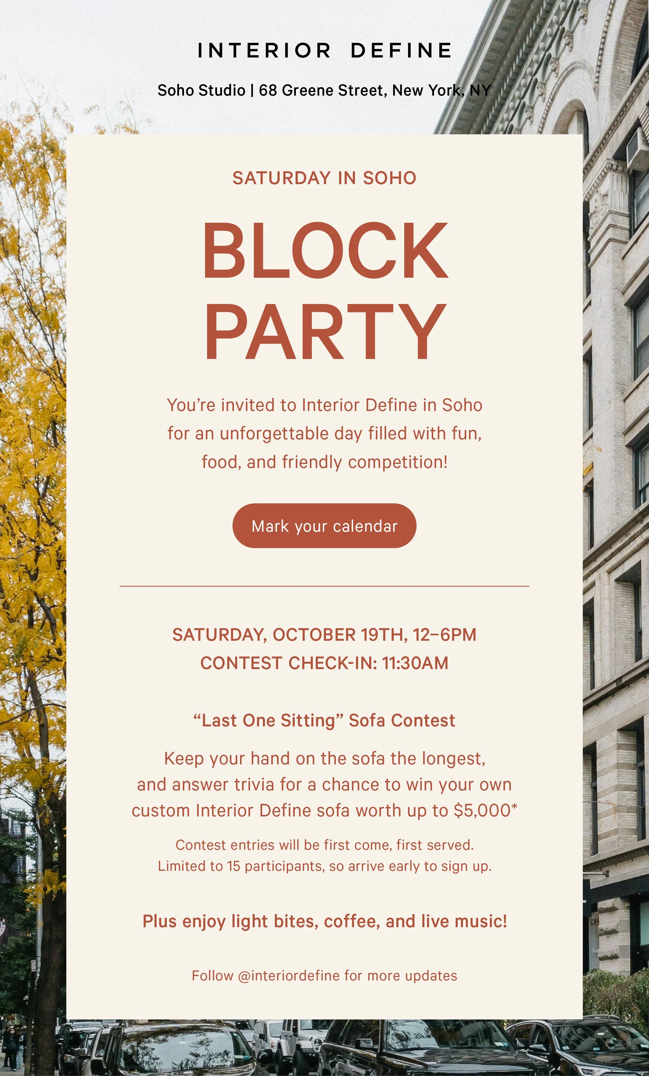 Interior Define is throwing a Block Party Saturday 10/19, at the SoHo Studio at 68 Greene Street, New York, NY from 12-6 PM.