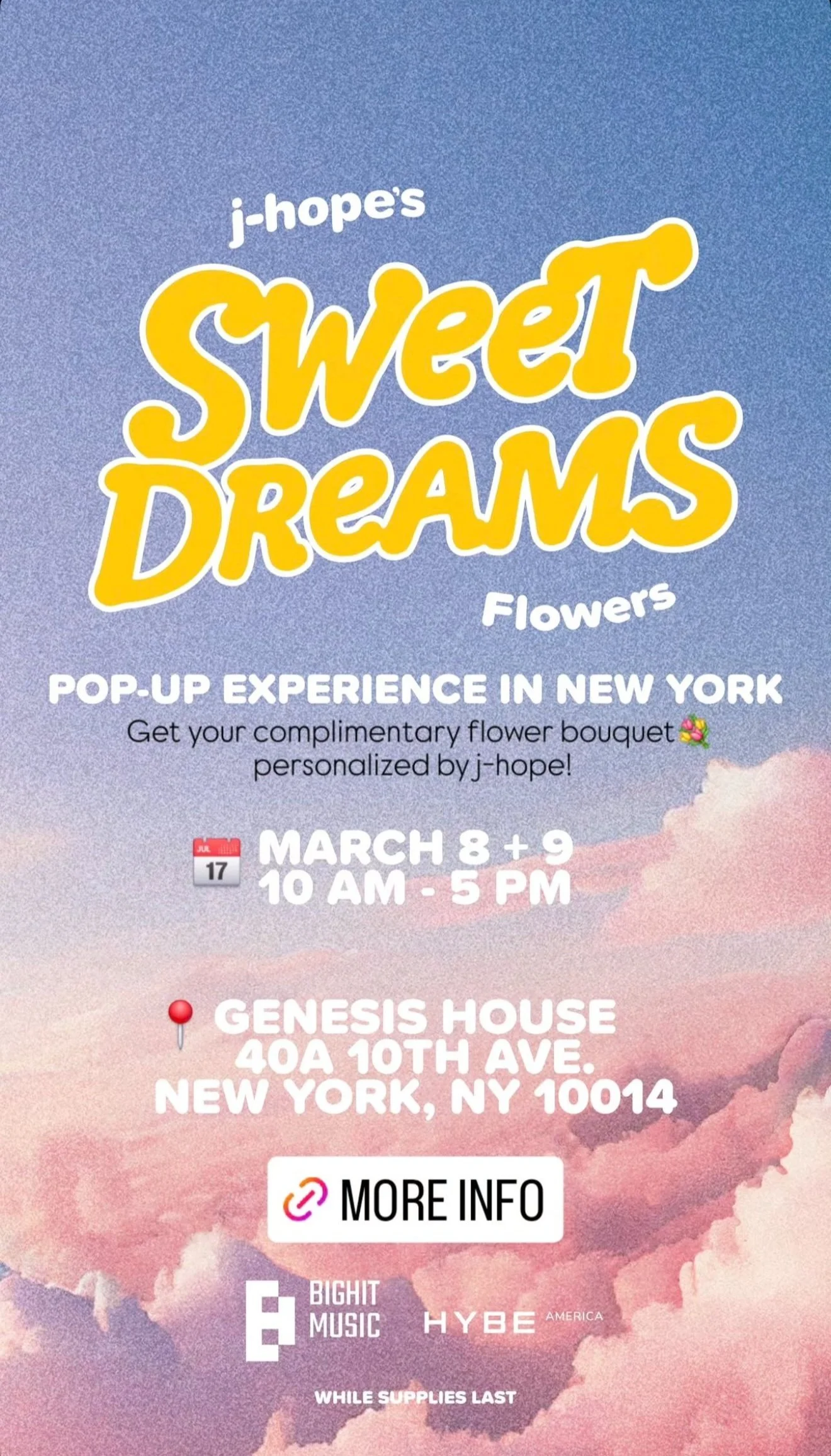 In celebration of BTS j-hope’s single “Sweet Dreams (feat. Miguel),” we are excited to announce the opening of ‘Sweet Dreams Flowers,’ a two-day pop-up experience in New York City where you are invited to create and take home your very own complimentary flower bouquet personalized by j-hope.