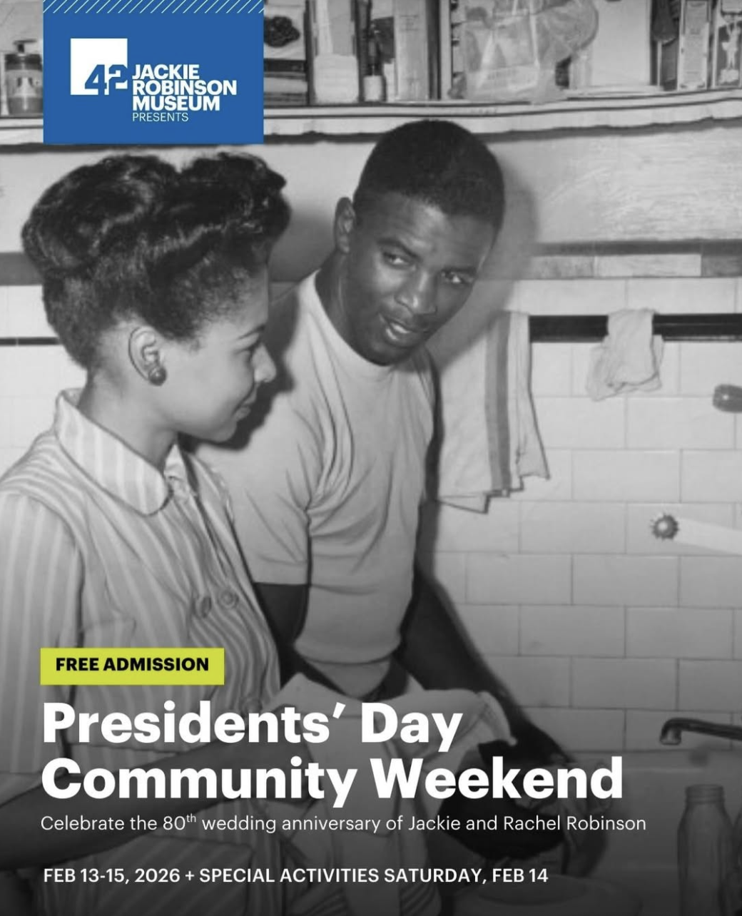Stop by all weekend or join us on Saturday, February 14 for a special Community Day honoring the 80th wedding anniversary of Jackie and Rachel Robinson, an enduring partnership that shaped history on and off the baseball diamond.