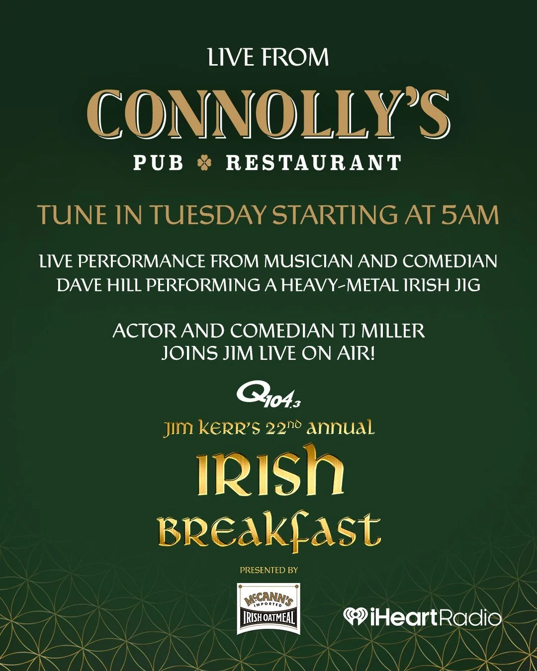 Comedians Dave Hill (@mrdavehill) and TJ Miller (@teenagemillionaire) will be Q104.3’s guests! Plus the first 200 Q104.3 listeners will receive a free Irish Breakfast, presented by @mccanns_irish_oatmeal!