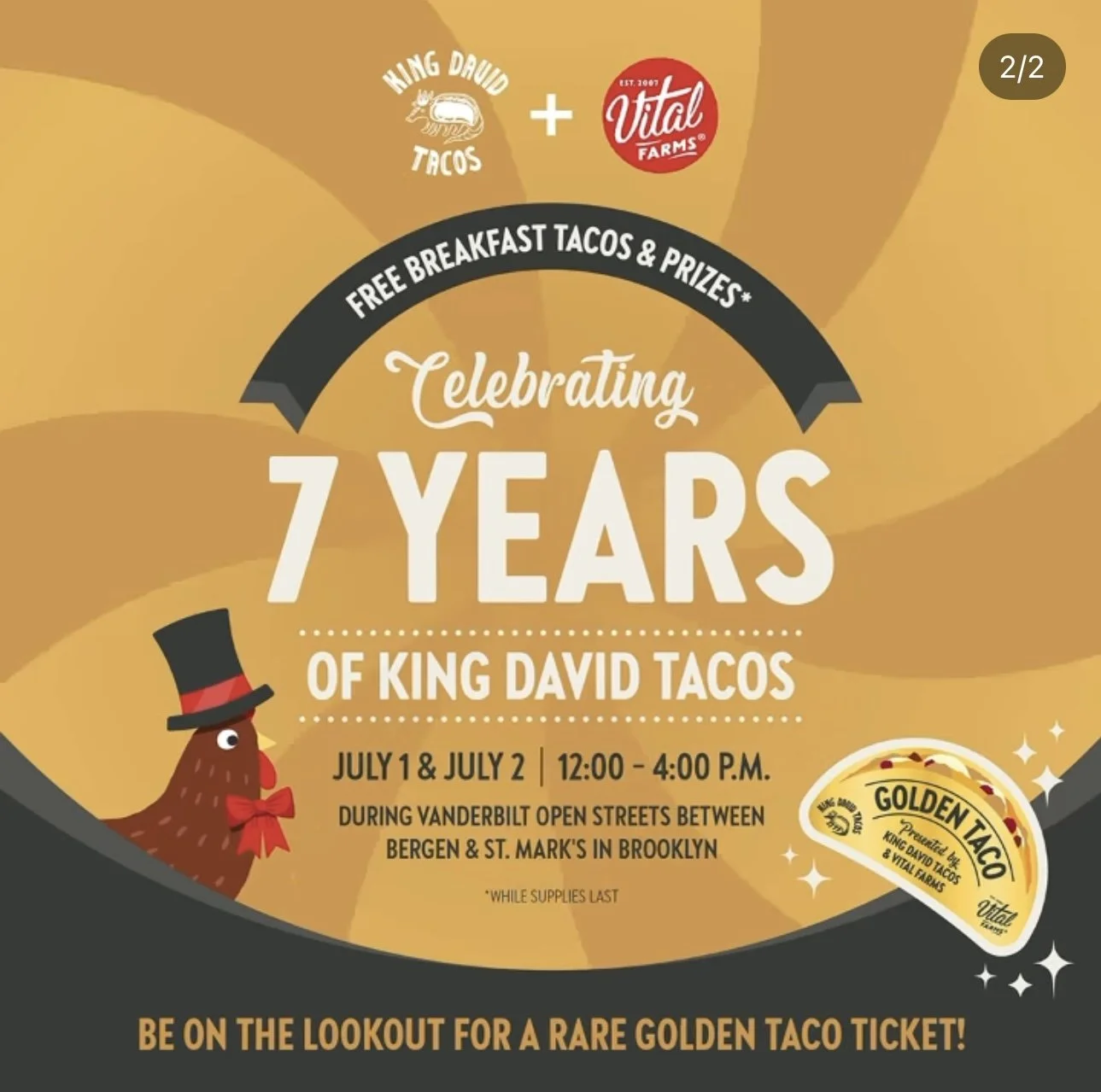 Celebrate King David Tacos 7th anniversary with FREE breakfast tacos with Vital Farms during Vanderbilt Open Streets this weekend.