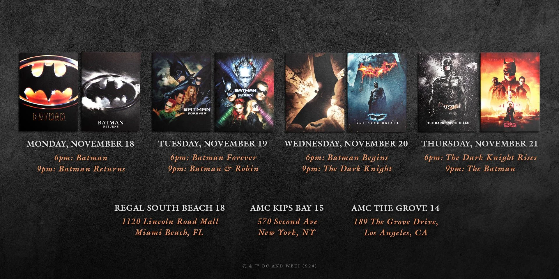 Ahead of the release, we will be hosting special movie screenings of eight iconic Batman movies—Batman (1989), Batman Returns, Batman Forever, Batman & Robin, Batman Begins, The Dark Knight, The Dark Knight Rises, and The Batman (2022).