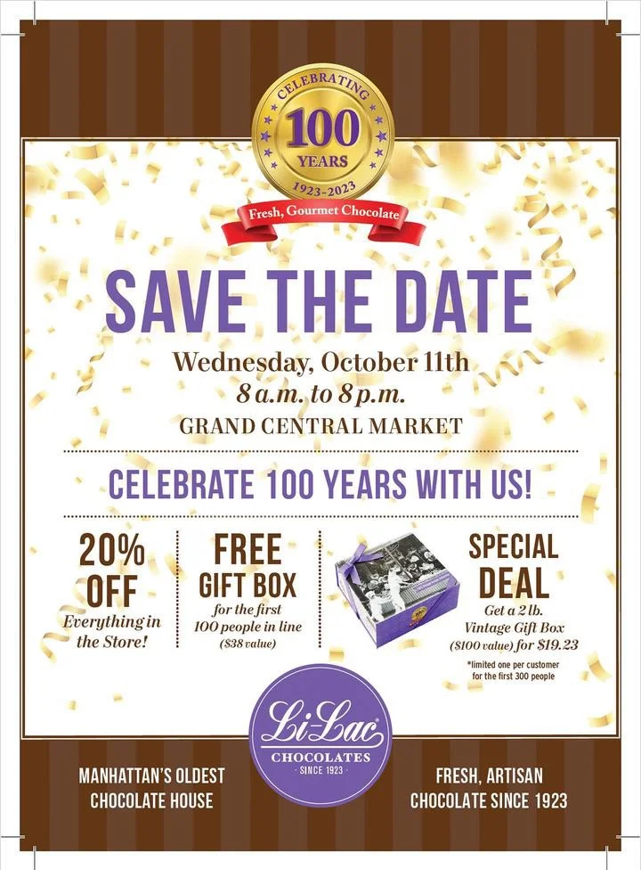 Wednesday at Grand Central Market & Friday at Industry City: The first 100 people in line will receive a free 20-piece chocolate box! ๐ซ Additionally, our Li-Lac Chocolates 2 lb. Vintage Giftbox, valued at $100, will be available for just $19.23 for the first 300 people.