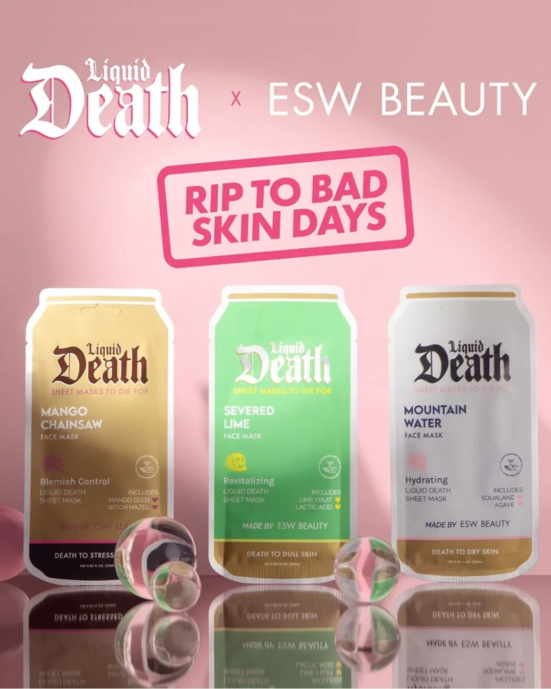 Enjoy 20% off all ESW Beauty products, including new Liquid Death sheet masks, plus 30% off all merch and accessories