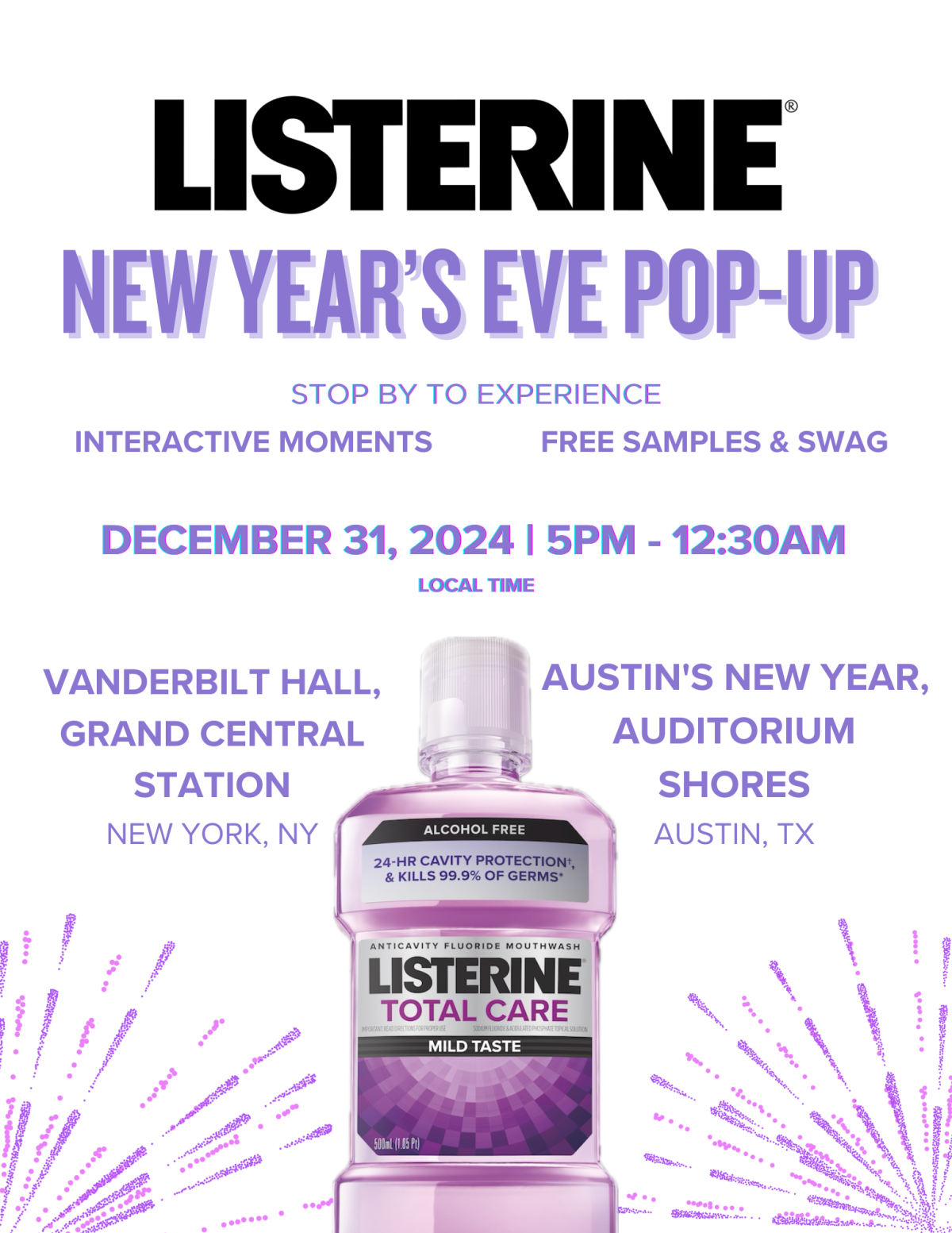 Enjoy an immersive experience that will inspire a fresh routine for a whole mouth clean. From 5pm-12:30am, the brand will share an interactive activity that allows you to “swish away the old and wish in the new,” alongside exciting photo experiences, exclusive swag and free product giveaways. Plus…be sure to stop by at 11:30 PM – our moment before the big moment – to receive exclusive LISTERINE swag and product so you can swish in the new year right!