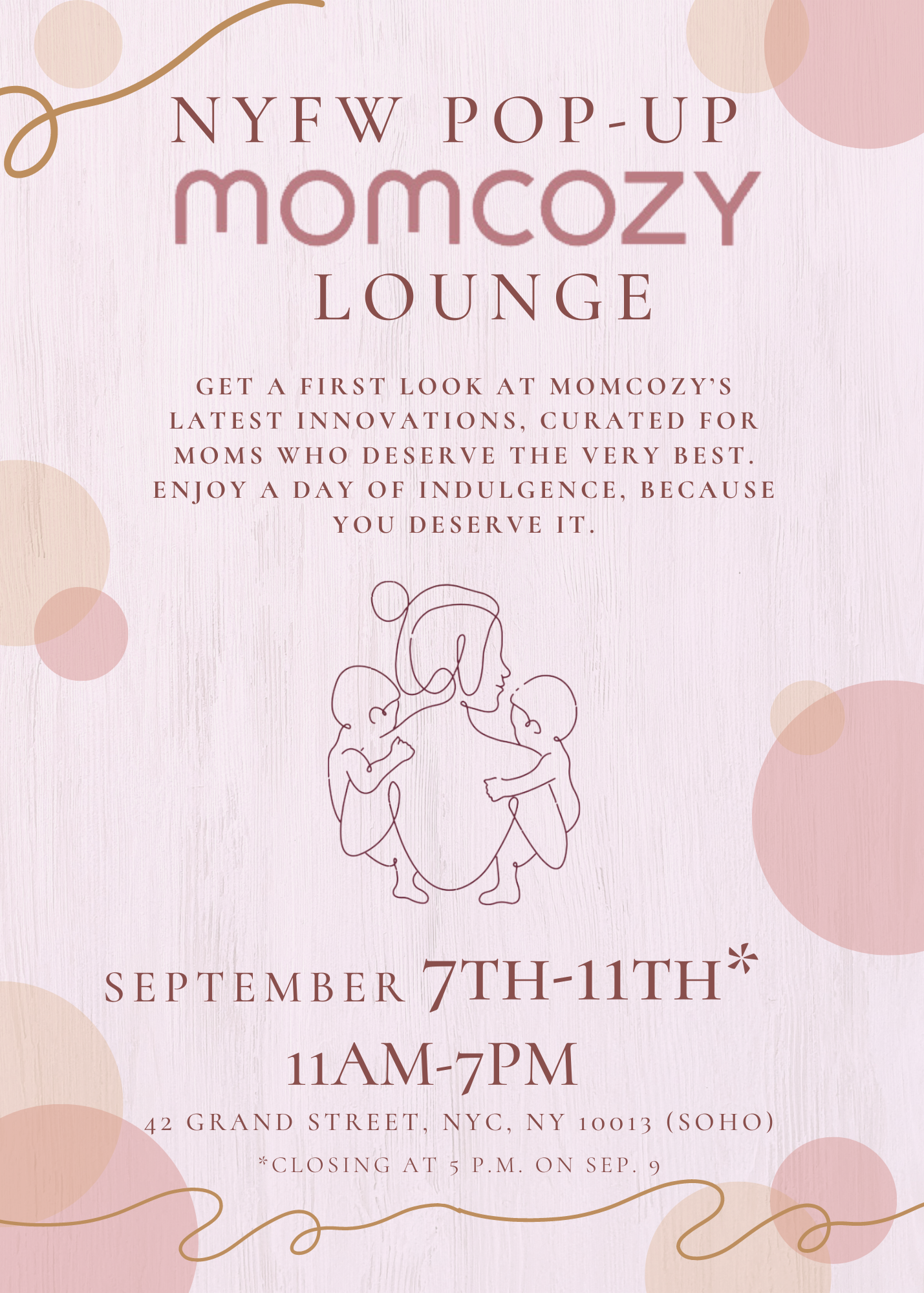 The Momcozy NYFW Pop-Up is open to the public beginning Saturday, September 7th through Wednesday, September 11th from 11AM-7PM and is located at 42 Grand Street, New York City, New York 10013 (SoHo). Note: The Pop-Up will close early on September 9th, at 5 PM.