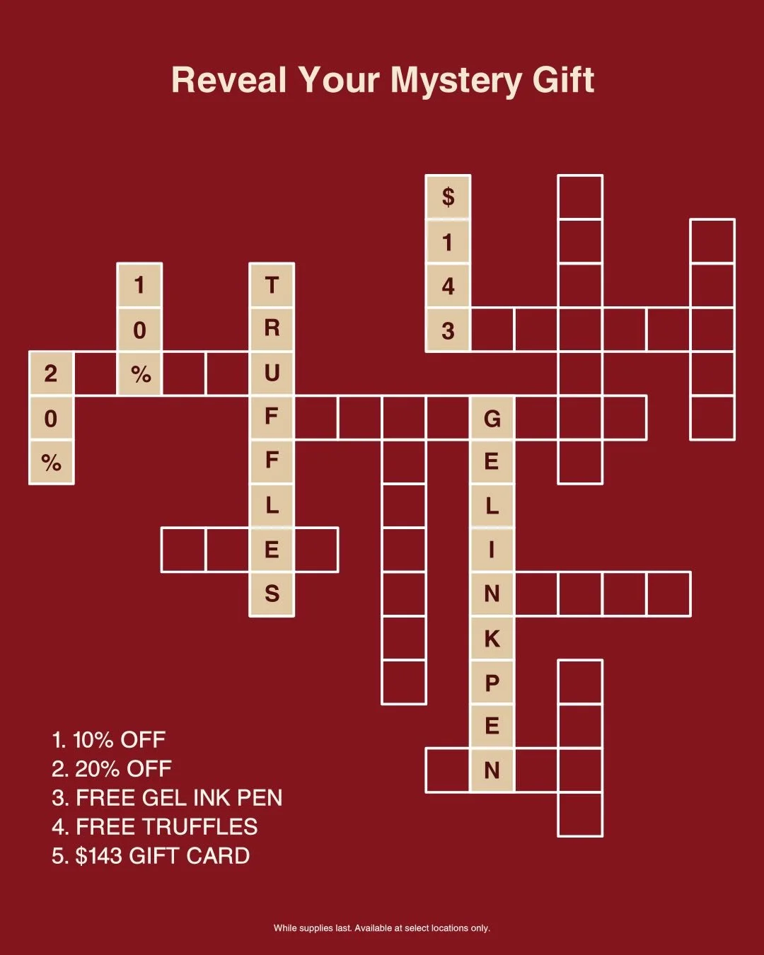Gifts include: free truffles, a gel pen, promo codes, gift cards and more.