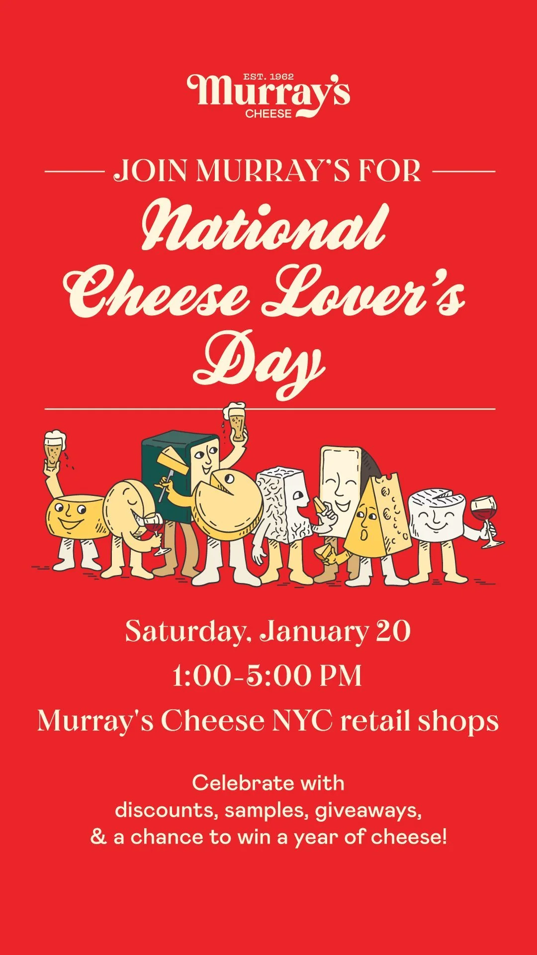 Celebrate National Cheese Lovers Day with Murray’s Cheese! Join them at their NYC shops for a day of free cheese samples, giveaways and more from 1-5pm. Plus, head to the Murray’s website for more details and to enter to win a year of cheese!