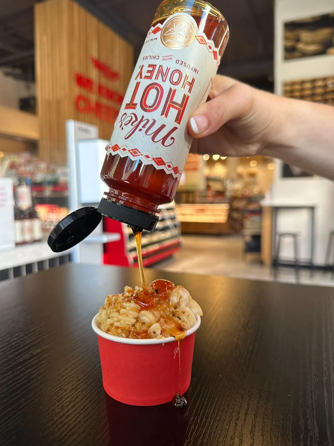 Sampling of limited edition Mike’s Hot Honey Fried Chicken Sandwich and Murray’s Mac drizzled with Mike’s Hot Honey