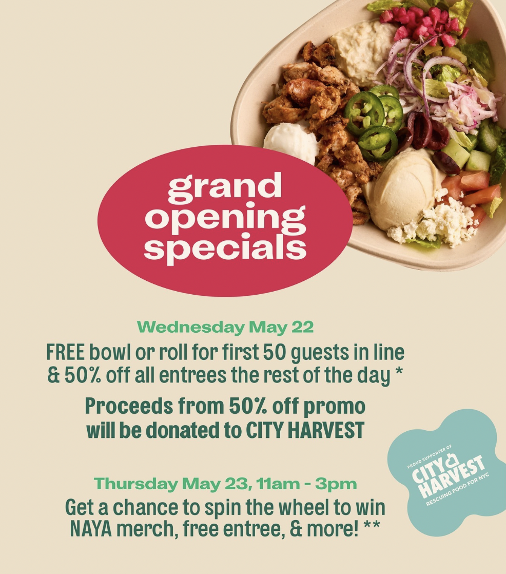 Visit on May 22nd at 11AM (9 W 42nd St, New York, NY 10036, across from the NYPL) for a free entree for the first 50 guests! ๐ฅ After that, a 50% discount will apply to one entree per order!*