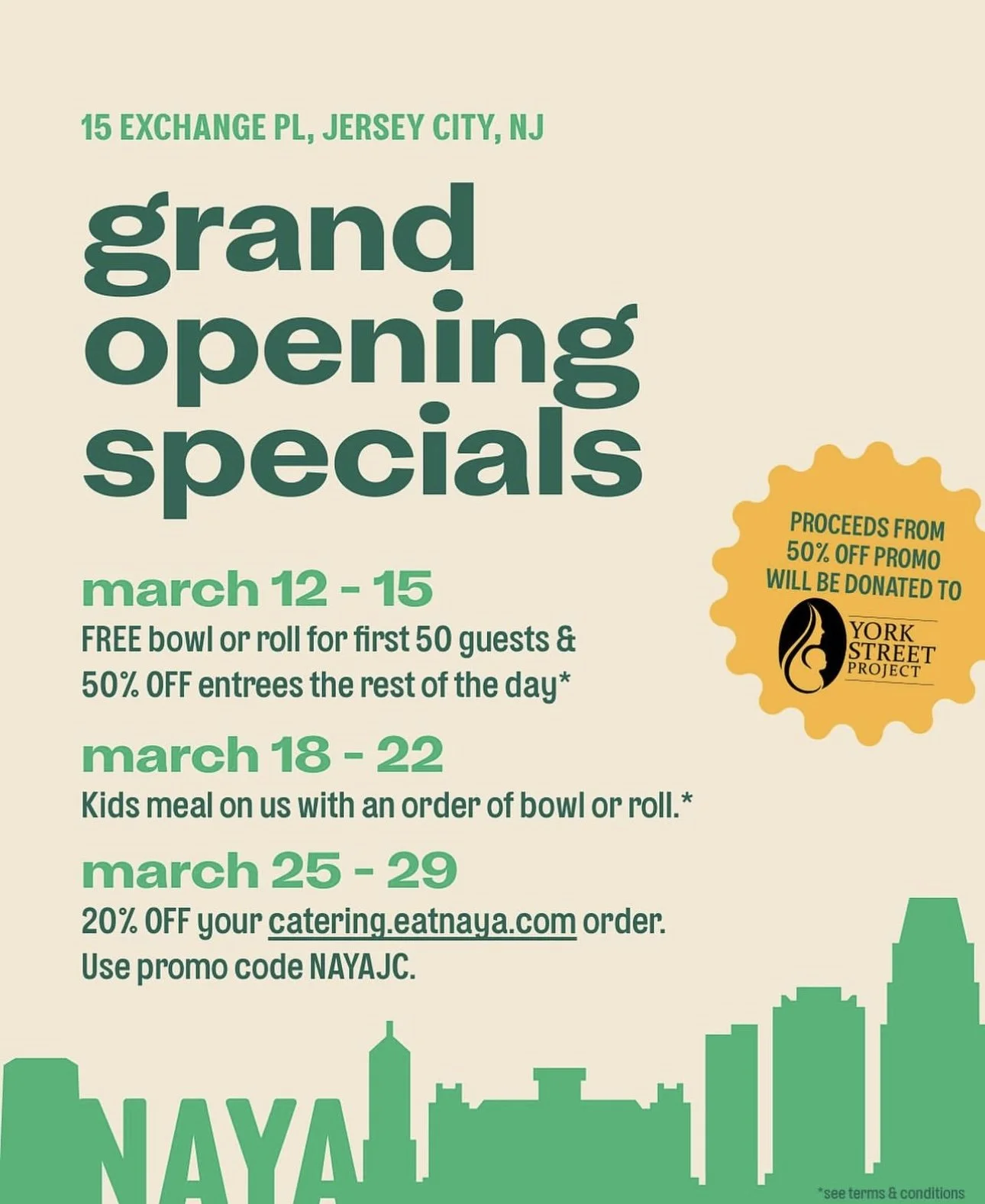 Naya Jersey City Grand Opening Tuesday, March 12, 2024 2:03 PM 2:03 PM 15 Exchange Place Jersey City, NJ, 07302 United States (map) Google Calendar ICS Naya is coming to Jersey City! Its grand opening is Tuesday March 12 from 12p to 9p. The first 50 guests get one free entree. After that, it’s 50% off bowls and rolls all week plus a Spin the Wheel with a chance to win Naya merch or another meal!